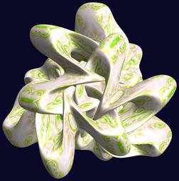 | Keywords: mathematica 3d cg parametricplot3d texture torus 輪環 りんかん ドーナツ どーなつ 六芒星 ろくぼうせい 六光星 ろくこうせい 六稜星 ろくりょうせい code program algorithm コード プログラム アルゴリズム hexagram geometric sculpture geometricsculpture shape geometry sculpture mapping テクスチャ マッピング 模様 もよう abstract 抽象 ちゅうしょう アブストラクト design pattern デザイン パターン graphic グラフィック グラフィクス structure 意匠 構造 symmetry 対称性 たいしょうせい シンメトリー 対称 たいしょう algorithm コード black background plant flower organic pattern food blossom a = 2; (* center hole size of a torus *) b = 6; (* hexa-torus *) c = 1; (* distance from the center of rotation *) d = 3; (* number of torus *) h = 0.7; (* height of a torus *) SetOptions[ParametricPlot3D, PlotRange -> Full, Mesh -> None, Boxed -> False, Axes -> False, PlotPoints -> 400, ImageSize -> 3000, Background -> RGBColor[{10, 10, 40}/255], PlotStyle -> Directive[Specularity[White, 30], Texture[Import["D:/tmp/864.jpg"]]], TextureCoordinateFunction -> ({#4, #5 2 Pi} &), Lighting -> "Neutral"]; f[v_] := Sin[2 Sin[Sin[Sin[v]]]]; x = (a - Cos[t] - Sin[b s]) Cos[s + Pi/(2 b)] + c; y = (a - Cos[t] - Sin[b s]) Sin[s + Pi/(2 b)] + c; z = (f[t] - h f[b s]) + c; rot = Table[{x, y, z}.RotationMatrix[2 i Pi/d, {0, 1, 1}], {i, d}]; ParametricPlot3D[rot, {t, 0, 2 Pi}, {s, 0, 2 Pi}] (*--- The Texture *) a = 2; (* center hole size of a torus *) b = 6; (* hexa-torus *) c = 1; (* distance from the center of rotation *) d = 3; (* number of torus *) h = 0.7; (* height of a torus *) SetOptions[ParametricPlot3D, PlotRange -> Full, Mesh -> None, Boxed -> False, Axes -> False, PlotPoints -> 400, ImageSize -> 3000, Background -> RGBColor[{10, 10, 40}/255], PlotStyle -> Directive[Specularity[White, 30], Texture[Import["D:/tmp/864.jpg"]]], TextureCoordinateFunction -> ({#4, #5 2 Pi} &), Lighting -> "Neutral"]; f[v_] := Sin[2 Sin[Sin[Sin[v]]]]; x = (a - Cos[t] - Sin[b s]) Cos[s + Pi/(2 b)] + c; y = (a - Cos[t] - Sin[b s]) Sin[s + Pi/(2 b)] + c; z = (f[t] - h f[b s]) + c; rot = Table[{x, y, z}.RotationMatrix[2 i Pi/d, {0, 1, 1}], {i, d}]; ParametricPlot3D[rot, {t, 0, 2 Pi}, {s, 0, 2 Pi}] (*--- The Texture *) |