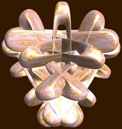 | Keywords: mathematica 3d cg parametricplot3d texture torus 輪環 りんかん ドーナツ どーなつ 八芒星 はちぼうせい 八光星 はちこうせい 八稜星 はちりょうせい code program algorithm コード プログラム アルゴリズム geometric sculpture geometricsculpture shape geometry sculpture mapping テクスチャ マッピング 模様 もよう abstract 抽象 ちゅうしょう アブストラクト design pattern デザイン パターン graphic グラフィック グラフィクス structure 意匠 構造 symmetry 対称性 たいしょうせい シンメトリー 対称 たいしょう algorithm コード black background indoor a = 3; (* center hole size of a torus *) b = 8; (* octa-torus *) c = -2; (* distance from the center of rotation *) d = 3; (* number of torus *) h = 2; (* height of a torus *) SetOptions[ParametricPlot3D, PlotRange -> Full, Mesh -> None, Boxed -> False, Axes -> False, PlotPoints -> 400, ImageSize -> 3000, Background -> Darker[Orange, 0.8], PlotStyle -> Directive[Specularity[White, 30], Texture[Import["D:/tmp/861.jpg"]]], TextureCoordinateFunction -> ({#4, #5 2 Pi} &), Lighting -> "Neutral"]; f[v_] := Sin[2 Sin[Sin[Sin[v]]]]; x = (a - Cos[t] - f[b s]) Cos[s + Pi/(2 b)]; y = (a - Cos[t] - f[b s]) Sin[s + Pi/(2 b)]; z = (a - Sin[t] - h f[b s]) + c; rm = Table[{x, y, z}.RotationMatrix[2 i Pi/d, {1, 0, 0}], {i, d}]; ParametricPlot3D[rm, {t, 0, 2 Pi}, {s, 0, 2 Pi}] (*--- The Texture *) a = 3; (* center hole size of a torus *) b = 8; (* octa-torus *) c = -2; (* distance from the center of rotation *) d = 3; (* number of torus *) h = 2; (* height of a torus *) SetOptions[ParametricPlot3D, PlotRange -> Full, Mesh -> None, Boxed -> False, Axes -> False, PlotPoints -> 400, ImageSize -> 3000, Background -> Darker[Orange, 0.8], PlotStyle -> Directive[Specularity[White, 30], Texture[Import["D:/tmp/861.jpg"]]], TextureCoordinateFunction -> ({#4, #5 2 Pi} &), Lighting -> "Neutral"]; f[v_] := Sin[2 Sin[Sin[Sin[v]]]]; x = (a - Cos[t] - f[b s]) Cos[s + Pi/(2 b)]; y = (a - Cos[t] - f[b s]) Sin[s + Pi/(2 b)]; z = (a - Sin[t] - h f[b s]) + c; rm = Table[{x, y, z}.RotationMatrix[2 i Pi/d, {1, 0, 0}], {i, d}]; ParametricPlot3D[rm, {t, 0, 2 Pi}, {s, 0, 2 Pi}] (*--- The Texture *) |