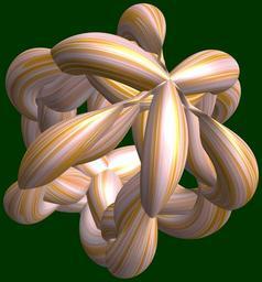 | Keywords: mathematica 3d cg parametricplot3d texture torus 輪環 りんかん ドーナツ どーなつ 五芒星 ごぼうせい 五光星 ごこうせい 五稜星 ごりょうせい program プログラム code コード algorithm コード アルゴリズム pentagram geometric sculpture geometricsculpture shape geometry sculpture mapping テクスチャ マッピング 模様 もよう abstract 抽象 ちゅうしょう アブストラクト design pattern デザイン パターン graphic グラフィック グラフィクス structure 意匠 構造 symmetry 対称性 たいしょうせい シンメトリー 対称 たいしょう algorithm organic pattern black background serene bright pastel photo border SetOptions[ParametricPlot3D, PlotRange -> Full, Mesh -> None, Boxed -> False, Axes -> None, PlotPoints -> 400, ImageSize -> 3000, Background -> Darker[Green, 0.8], PlotStyle -> Directive[Specularity[White, 30], Texture[Import["D:/tmp/861.jpg"]]], TextureCoordinateFunction -> ({#4 + #5, #5/Pi} &), Lighting -> "Neutral"]; a = 5; (* center hole size of a torus *) b = 6; (* hexa-torus *) d = 3; (* number of torus *) v = 2.5; x = (a - Cos[t] - Sin[b s]) Cos[v (s + Pi/(2 b))]; y = Sin[t] Sin[b s]; z = (a - Cos[t] - Sin[b s]) Sin[v (s + Pi/(2 b))]; rot = Table[{x, y, z}.RotationMatrix[2 i Pi/d, {1, 0, 0}], {i, d}]; ParametricPlot3D[rot, {t, 0, 2 Pi}, {s, 0, 2 Pi}] (*--- The Texture *) SetOptions[ParametricPlot3D, PlotRange -> Full, Mesh -> None, Boxed -> False, Axes -> None, PlotPoints -> 400, ImageSize -> 3000, Background -> Darker[Green, 0.8], PlotStyle -> Directive[Specularity[White, 30], Texture[Import["D:/tmp/861.jpg"]]], TextureCoordinateFunction -> ({#4 + #5, #5/Pi} &), Lighting -> "Neutral"]; a = 5; (* center hole size of a torus *) b = 6; (* hexa-torus *) d = 3; (* number of torus *) v = 2.5; x = (a - Cos[t] - Sin[b s]) Cos[v (s + Pi/(2 b))]; y = Sin[t] Sin[b s]; z = (a - Cos[t] - Sin[b s]) Sin[v (s + Pi/(2 b))]; rot = Table[{x, y, z}.RotationMatrix[2 i Pi/d, {1, 0, 0}], {i, d}]; ParametricPlot3D[rot, {t, 0, 2 Pi}, {s, 0, 2 Pi}] (*--- The Texture *) |