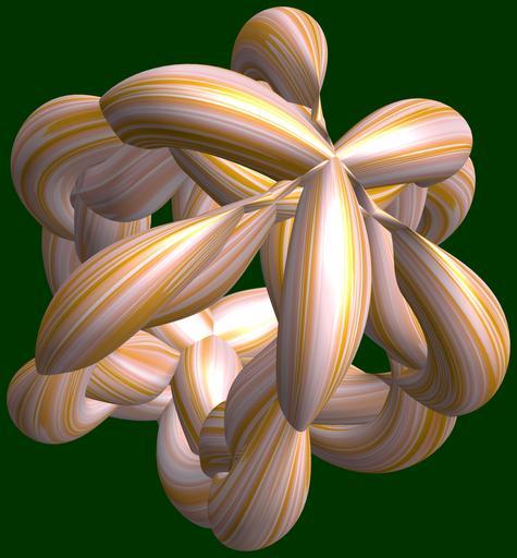 Keywords: mathematica 3d cg parametricplot3d texture torus 輪環 りんかん ドーナツ どーなつ 五芒星 ごぼうせい 五光星 ごこうせい 五稜星 ごりょうせい program プログラム code コード algorithm コード アルゴリズム pentagram geometric sculpture geometricsculpture shape geometry sculpture mapping テクスチャ マッピング 模様 もよう abstract 抽象 ちゅうしょう アブストラクト design pattern デザイン パターン graphic グラフィック グラフィクス structure 意匠 構造 symmetry 対称性 たいしょうせい シンメトリー 対称 たいしょう algorithm organic pattern black background serene bright pastel photo border SetOptions[ParametricPlot3D, PlotRange -> Full, Mesh -> None, Boxed -> False, Axes -> None, PlotPoints -> 400, ImageSize -> 3000, Background -> Darker[Green, 0.8], PlotStyle -> Directive[Specularity[White, 30], Texture[Import["D:/tmp/861.jpg"]]], TextureCoordinateFunction -> ({#4 + #5, #5/Pi} &), Lighting -> "Neutral"]; a = 5; (* center hole size of a torus *) b = 6; (* hexa-torus *) d = 3; (* number of torus *) v = 2.5; x = (a - Cos[t] - Sin[b s]) Cos[v (s + Pi/(2 b))]; y = Sin[t] Sin[b s]; z = (a - Cos[t] - Sin[b s]) Sin[v (s + Pi/(2 b))]; rot = Table[{x, y, z}.RotationMatrix[2 i Pi/d, {1, 0, 0}], {i, d}]; ParametricPlot3D[rot, {t, 0, 2 Pi}, {s, 0, 2 Pi}] (*--- The Texture *) SetOptions[ParametricPlot3D, PlotRange -> Full, Mesh -> None, Boxed -> False, Axes -> None, PlotPoints -> 400, ImageSize -> 3000, Background -> Darker[Green, 0.8], PlotStyle -> Directive[Specularity[White, 30], Texture[Import["D:/tmp/861.jpg"]]], TextureCoordinateFunction -> ({#4 + #5, #5/Pi} &), Lighting -> "Neutral"]; a = 5; (* center hole size of a torus *) b = 6; (* hexa-torus *) d = 3; (* number of torus *) v = 2.5; x = (a - Cos[t] - Sin[b s]) Cos[v (s + Pi/(2 b))]; y = Sin[t] Sin[b s]; z = (a - Cos[t] - Sin[b s]) Sin[v (s + Pi/(2 b))]; rot = Table[{x, y, z}.RotationMatrix[2 i Pi/d, {1, 0, 0}], {i, d}]; ParametricPlot3D[rot, {t, 0, 2 Pi}, {s, 0, 2 Pi}] (*--- The Texture *)
