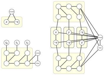 | Keywords: 3SAT-3COL reduction.svg Gadgets for an NP-completeness proof of graph 3-coloring by reduction from 3-Satisfiability The variable and clause gadgets are shown on the upper and lower left respectively and the right side of the figure shows the complete reduction for the instance x ˆ¨ y ˆ¨ ~z ˆ§ ~x ˆ¨ ~y ˆ¨ z with three variables and two clauses This reduction is from Oded Goldreich Computational Complexity A Conceptual Perspective Cambridge University Press 2008 Proposition 2 27 p 81 own David Eppstein 2012-02-26 Graph coloring Boolean satisfiability problem Files by User David Eppstein from en wikipedia Cc-zero |