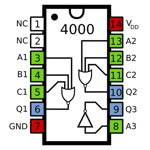 Keywords: 4000 Pinout.svg en The pinout of the 4000 dual 3-input NOR gate and inverter own Inductiveload 2009-03-02 IC pinout diagrams