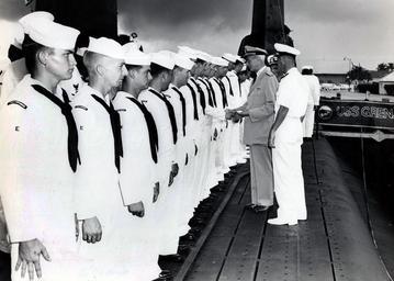 | Keywords: 40th anniversary of USS Grenadier DVIDS175845.jpg en In this undated file photo Adm Jerauld Wright commander in chief U S Atlantic Fleet personally congratulates each member of the crew of the Tench-class diesel submarine USS Grenadier after awarding the crew the Jerauld Wright Award 'a case of Jack Daniels Old No 7 Black Label Tennessee Sour Mash Whiskey ' The Grenadier earned the award May 29 1959 for providing proof that the Soviet Union was conducting submarine operations in the Atlantic Ocean 1959 https //www dvidshub net/image/175845 090529-N-+++++-056 2009-05-30 02 27 KEY WEST FL US PD-USGov-Military-Navy Images from DoD uploaded by Fæ USS Grenadier SS-525 |