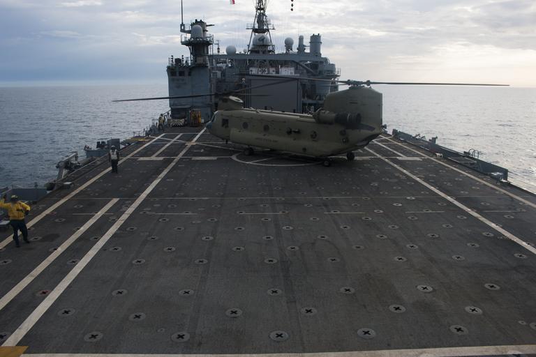 | Keywords: 40th cab 40thcab 40th combat aviation brigade 40thcombataviationbrigade ch-47 chinook ch47chinook chinook helicopter deck landing qualification decklandingqualification dlq deck landing decklanding uss ponce ussponce afsb afloat forward staging base afloatforwardstagingbase aviation pilot army soldier california army national guard californiaarmynationalguard 1-168 avn 1168avn washington national guard washingtonnationalguard oregon national guard oregonnationalguard persian gulf persiangulf outdoor An Army National Guard Ch-47 Chinook helicopter from Company B, 1st Battalion, 168th Aviation Regiment, 40th Combat Aviation Brigade, lands aboard the USS Ponce, an Afloat Forward Staging Base, in the Persian Gulf March 14. The 40th CAB practices landings aboard Naval vessels every month. (U.S. Army photo by Staff Sgt. Ian M. Kummer) An Army National Guard Ch-47 Chinook helicopter from Company B, 1st Battalion, 168th Aviation Regiment, 40th Combat Aviation Brigade, lands aboard the USS Ponce, an Afloat Forward Staging Base, in the Persian Gulf March 14. The 40th CAB practices landings aboard Naval vessels every month. (U.S. Army photo by Staff Sgt. Ian M. Kummer) |