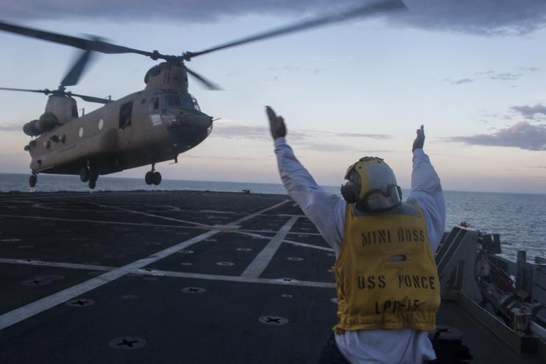 Keywords: 40th cab 40thcab 40th combat aviation brigade 40thcombataviationbrigade ch-47 chinook ch47chinook chinook helicopter deck landing qualification decklandingqualification dlq deck landing decklanding uss ponce ussponce afsb afloat forward staging base afloatforwardstagingbase aviation pilot army soldier california army national guard californiaarmynationalguard 1-168 avn 1168avn washington national guard washingtonnationalguard oregon national guard oregonnationalguard persian gulf persiangulf outdoor An Army National Guard Ch-47 Chinook helicopter from Company B, 1st Battalion, 168th Aviation Regiment, 40th Combat Aviation Brigade, takes off from the USS Ponce, an Afloat Forward Staging Base, in the Persian Gulf March 14. The 40th CAB practices landings aboard Naval vessels every month. (U.S. Army photo by Staff Sgt. Ian M. Kummer) An Army National Guard Ch-47 Chinook helicopter from Company B, 1st Battalion, 168th Aviation Regiment, 40th Combat Aviation Brigade, takes off from the USS Ponce, an Afloat Forward Staging Base, in the Persian Gulf March 14. The 40th CAB practices landings aboard Naval vessels every month. (U.S. Army photo by Staff Sgt. Ian M. Kummer)