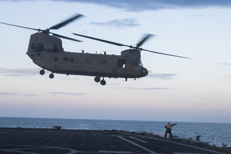 | Keywords: 40th cab 40thcab 40th combat aviation brigade 40thcombataviationbrigade ch-47 chinook ch47chinook chinook helicopter deck landing qualification decklandingqualification dlq deck landing decklanding uss ponce ussponce afsb afloat forward staging base afloatforwardstagingbase aviation pilot army soldier california army national guard californiaarmynationalguard 1-168 avn 1168avn washington national guard washingtonnationalguard oregon national guard oregonnationalguard persian gulf persiangulf vehicle aircraft outdoor rotor blade airplane An Army National Guard Ch-47 Chinook helicopter from Company B, 1st Battalion, 168th Aviation Regiment, 40th Combat Aviation Brigade, takes off from the USS Ponce, an Afloat Forward Staging Base, in the Persian Gulf March 14. The 40th CAB practices landings aboard Naval vessels every month. (U.S. Army photo by Staff Sgt. Ian M. Kummer) An Army National Guard Ch-47 Chinook helicopter from Company B, 1st Battalion, 168th Aviation Regiment, 40th Combat Aviation Brigade, takes off from the USS Ponce, an Afloat Forward Staging Base, in the Persian Gulf March 14. The 40th CAB practices landings aboard Naval vessels every month. (U.S. Army photo by Staff Sgt. Ian M. Kummer)  |