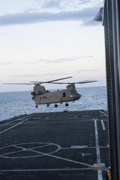 | Keywords: 40th cab 40thcab 40th combat aviation brigade 40thcombataviationbrigade ch-47 chinook ch47chinook chinook helicopter deck landing qualification decklandingqualification dlq deck landing decklanding uss ponce ussponce afsb afloat forward staging base afloatforwardstagingbase aviation pilot army soldier california army national guard californiaarmynationalguard 1-168 avn 1168avn washington national guard washingtonnationalguard oregon national guard oregonnationalguard persian gulf persiangulf outdoor An Army National Guard Ch-47 Chinook helicopter from Company B, 1st Battalion, 168th Aviation Regiment, 40th Combat Aviation Brigade, lands aboard the USS Ponce, an Afloat Forward Staging Base, in the Persian Gulf March 14. The 40th CAB practices landings aboard Naval vessels every month. (U.S. Army photo by Staff Sgt. Ian M. Kummer) An Army National Guard Ch-47 Chinook helicopter from Company B, 1st Battalion, 168th Aviation Regiment, 40th Combat Aviation Brigade, lands aboard the USS Ponce, an Afloat Forward Staging Base, in the Persian Gulf March 14. The 40th CAB practices landings aboard Naval vessels every month. (U.S. Army photo by Staff Sgt. Ian M. Kummer) |