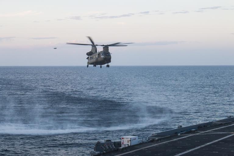 | Keywords: 40th cab 40thcab 40th combat aviation brigade 40thcombataviationbrigade ch-47 chinook ch47chinook chinook helicopter deck landing qualification decklandingqualification dlq deck landing decklanding uss ponce ussponce afsb afloat forward staging base afloatforwardstagingbase aviation pilot army soldier california army national guard californiaarmynationalguard 1-168 avn 1168avn washington national guard washingtonnationalguard oregon national guard oregonnationalguard persian gulf persiangulf outdoor An Army National Guard Ch-47 Chinook helicopter from Company B, 1st Battalion, 168th Aviation Regiment, 40th Combat Aviation Brigade, lands aboard the USS Ponce, an Afloat Forward Staging Base, in the Persian Gulf March 14. The 40th CAB practices landings aboard Naval vessels every month. (U.S. Army photo by Staff Sgt. Ian M. Kummer) An Army National Guard Ch-47 Chinook helicopter from Company B, 1st Battalion, 168th Aviation Regiment, 40th Combat Aviation Brigade, lands aboard the USS Ponce, an Afloat Forward Staging Base, in the Persian Gulf March 14. The 40th CAB practices landings aboard Naval vessels every month. (U.S. Army photo by Staff Sgt. Ian M. Kummer)  |
