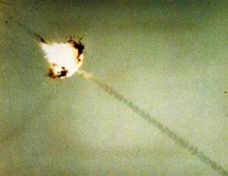 | Keywords: 428-GX-KN-28164: The annular blast fragmentation warhead of an AIM-9L Sidewinder missile detonates on striking a QF-86 drone aircraft target five seconds after the missile was fired from an F-14A “Tomcat” fighter at Naval Weapons Center, China Lake, California. Photographed October 29, 1977. U.S. Navy photograph, now in the collections of the National Archives. (2015/12/15). 428-GX-KN-28164: The annular blast fragmentation warhead of an AIM-9L Sidewinder missile detonates on striking a QF-86 drone aircraft target five seconds after the missile was fired from an F-14A “Tomcat” fighter at Naval Weapons Center, China Lake, California. Photographed October 29, 1977. U.S. Navy photograph, now in the collections of the National Archives. (2015/12/15). |