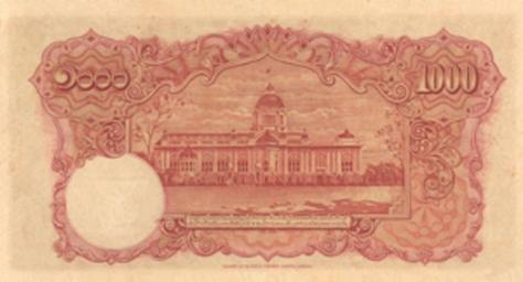 | Keywords: 4.1000bahtbk.gif en Reverse side of the THB 1 000 banknote Series 4 - first come into circulation during the reign of King Rama VIII circa 1938 th ภาพด้านหลังของธนบัตรราคา 1000 บาท แบบ 4 ออกใช้ในสมัยรัชกาลที่ 8 ราวปี พ ศ 2481 1938 https //www bot or th/Thai/Banknotes/HistoryAndSeriesOfBanknotes/Pages/Banknote_Series04_2 aspx Bank of Thailand other versions Custom license marker 2015 03 14 PD-Thailand Uploaded with UploadWizard Banknotes of Thailand Banknotes with a face value of 1000 | ||||