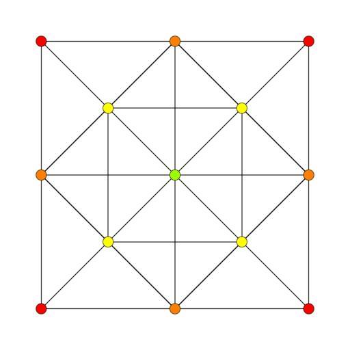 Keywords: 4 21 polytope B2 Petrie.svg Gosset 4_21 polytope as orthogonal projection graph in B2 Petrie polygon basis Red orange yellow green vertices have multiplicity of 1 12 32 60 <br/> Projection basis of 2-cube square v1 1 0 v2 0 1 Transferred from http //en wikipedia org en wikipedia; transferred to Commons by User Sreejithk2000 using http //tools wikimedia de/~magnus/commonshelper php CommonsHelper <br/> Original text I Tom Ruen talk created this work entirely by myself 00 06 25 February 2010 UTC <br/> Tomruen original upload log page en wikipedia 4_21_polytope_B2_Petrie svg 2010-02-25 00 06 Tomruen 800×800× 409396 bytes <nowiki> Gosset 4_21 polytope as orthogonal projection graph in B2 Petrie polygon basis I ~~~ created this work entirely by myself ~~~~~ ~~~ p</nowiki> Set of colored Coxeter plane graphs; 13 vertices