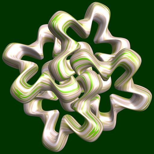 Keywords: mathematica 3d cg parametricplot3d texture torus 輪環 りんかん ドーナツ どーなつ 五芒星 ごぼうせい 五光星 ごこうせい 五稜星 ごりょうせい プログラム コード code program algorithm コード アルゴリズム pentagram geometric sculpture geometricsculpture shape geometry sculpture mapping テクスチャ マッピング 模様 もよう design pattern デザイン パターン graphic グラフィック グラフィクス structure 意匠 構造 symmetry 対称性 たいしょうせい シンメトリー 対称 たいしょう algorithm indoor SetOptions[ParametricPlot3D, PlotRange -> Full, Mesh -> None, Boxed -> False, Axes -> None, PlotPoints -> 300, ImageSize -> 3000, Background -> Darker[Green, 0.8], PlotStyle -> Directive[Specularity[White, 30], Texture[Import["D:/tmp/862.jpg"]]], TextureCoordinateFunction -> ({#4 + #5, #5/Pi} &), Lighting -> "Neutral"]; a = 3; (* center hole size of a torus *) b = 5; (* penta-torus *) c = 3; (* distance from the center of rotation *) d = 4; (* number of torus *) f[v_] := Sin[2 Sin[Sin[Sin[v]]]]; x = (a - Cos[t] - f[b s]) Cos[s + Pi/(2 b)] + c; y = Sin[t] + c; z = (a - Cos[t] - f[b s]) Sin[s + Pi/(2 b)] + c; rot = Table[{x, y, z}.RotationMatrix[2 i Pi/d, {1, 2, 0}], {i, d}]; ParametricPlot3D[rot, {t, 0, 2 Pi}, {s, 0, 2 Pi}] (* --- The Texture *) SetOptions[ParametricPlot3D, PlotRange -> Full, Mesh -> None, Boxed -> False, Axes -> None, PlotPoints -> 300, ImageSize -> 3000, Background -> Darker[Green, 0.8], PlotStyle -> Directive[Specularity[White, 30], Texture[Import["D:/tmp/862.jpg"]]], TextureCoordinateFunction -> ({#4 + #5, #5/Pi} &), Lighting -> "Neutral"]; a = 3; (* center hole size of a torus *) b = 5; (* penta-torus *) c = 3; (* distance from the center of rotation *) d = 4; (* number of torus *) f[v_] := Sin[2 Sin[Sin[Sin[v]]]]; x = (a - Cos[t] - f[b s]) Cos[s + Pi/(2 b)] + c; y = Sin[t] + c; z = (a - Cos[t] - f[b s]) Sin[s + Pi/(2 b)] + c; rot = Table[{x, y, z}.RotationMatrix[2 i Pi/d, {1, 2, 0}], {i, d}]; ParametricPlot3D[rot, {t, 0, 2 Pi}, {s, 0, 2 Pi}] (* --- The Texture *)
