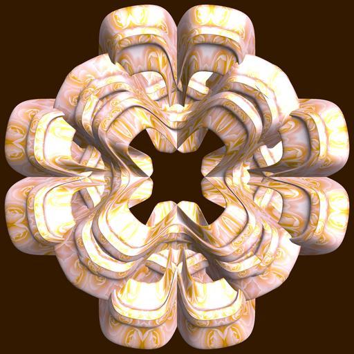 | Keywords: mathematica 3d cg parametricplot3d texture torus 輪環 りんかん ドーナツ どーなつ 五芒星 ごぼうせい 五光星 ごこうせい 五稜星 ごりょうせい code program algorithm コード プログラム アルゴリズム pentagram geometric sculpture geometricsculpture shape geometry sculpture mapping テクスチャ マッピング 模様 もよう abstract 抽象 ちゅうしょう アブストラクト design pattern デザイン パターン graphic グラフィック グラフィクス structure 意匠 構造 symmetry 対称性 たいしょうせい シンメトリー 対称 たいしょう algorithm コード indoor black background pastel animal a = 5; (* center hole size of a torus *) b = 5; (* penta-torus *) c = 1; (* distance from the center of rotation *) d = 4; (* number of torus *) h = 1; (* height of a torus *) SetOptions[ParametricPlot3D, PlotRange -> Full, Mesh -> None, Boxed -> False, Axes -> False, PlotPoints -> 400, ImageSize -> 3000, Background -> Darker[Orange, 0.8], PlotStyle -> Directive[Specularity[White, 30], Texture[Import["D:/tmp/861.jpg"]]], TextureCoordinateFunction -> ({#4, #5 2 Pi} &), Lighting -> "Neutral"]; f[v_] := Sin[2 Sin[Sin[Sin[v]]]]; g[v_] := Sum[Cos[(2 k - 1) v]/(2 k - 1), {k, 4}]; x = (a - g[t] - f[b s]) Cos[s + 3 Pi/(4 b)] + c; y = (a - g[t] - f[b s]) Sin[s + 3 Pi/(4 b)] + c; z = (a - Sin[t] - h f[b s]); rot = Table[{x, y, z}.RotationMatrix[2 i Pi/d, {0, 0, 1}], {i, d}]; ParametricPlot3D[rot, {t, 0, 2 Pi}, {s, 0, 2 Pi}] (*--- The Texture *) a = 5; (* center hole size of a torus *) b = 5; (* penta-torus *) c = 1; (* distance from the center of rotation *) d = 4; (* number of torus *) h = 1; (* height of a torus *) SetOptions[ParametricPlot3D, PlotRange -> Full, Mesh -> None, Boxed -> False, Axes -> False, PlotPoints -> 400, ImageSize -> 3000, Background -> Darker[Orange, 0.8], PlotStyle -> Directive[Specularity[White, 30], Texture[Import["D:/tmp/861.jpg"]]], TextureCoordinateFunction -> ({#4, #5 2 Pi} &), Lighting -> "Neutral"]; f[v_] := Sin[2 Sin[Sin[Sin[v]]]]; g[v_] := Sum[Cos[(2 k - 1) v]/(2 k - 1), {k, 4}]; x = (a - g[t] - f[b s]) Cos[s + 3 Pi/(4 b)] + c; y = (a - g[t] - f[b s]) Sin[s + 3 Pi/(4 b)] + c; z = (a - Sin[t] - h f[b s]); rot = Table[{x, y, z}.RotationMatrix[2 i Pi/d, {0, 0, 1}], {i, d}]; ParametricPlot3D[rot, {t, 0, 2 Pi}, {s, 0, 2 Pi}] (*--- The Texture *) |