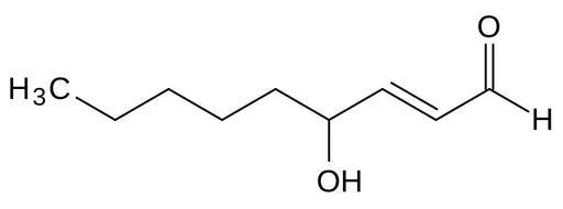 Keywords: 4-Hydroxy-2-nonenal.svg Chemical structure of trans-4-hydroxy-2-nonenal own drawn with BKchem 2007-08-22 Dschanz Aldehydes Allyl alcohol Fatty alcohols