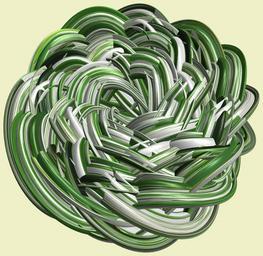 | Keywords: mathematica 3d cg parametricplot3d texture torus code program algorithm プログラム コード アルゴリズム 輪環 りんかん ドーナツ どーなつ トーラス とーらす knot 結び目 むすびめ mapping テクスチャ マッピング 模様 もよう design pattern デザイン パターン graphic グラフィック グラフィクス structure 意匠 構造 symmetry 対称性 たいしょうせい シンメトリー 対称 たいしょう indoor white background tangle a = 13; (* center hole size of a torus *) b1 = 9;(* the number of angles *) b2 = 4;(* the number of waves *) b3 = 4; (* the number of knots *) c = 4; (* distance from the center of rotation *) d = 4; (* the number of tori *) h1 = 3; (* width of a torus *) h2 = 2; (* width of a torus *) h3 = 8; (* height of cross *) SetOptions[ParametricPlot3D, PlotRange -> Full, Mesh -> None, Boxed -> False, Axes -> None, PlotPoints -> 500, ImageSize -> 3000, Background -> RGBColor[{240, 240, 200}/255], PlotStyle -> Directive[Specularity[White, 50], Texture[Import["D:/tmp/911.jpg"]]], TextureCoordinateFunction -> ({#4, #5 /Pi} &), Lighting -> "Neutral"]; x = (a - h1 Cos[t] + h2 Sin[b1 s]) Cos[b3 s] + c; y = (a - h1 Cos[t] + h2 Sin[b1 s]) Sin[b3 s] + c; z = h3 Cos[b1 s] + Sin[b2 t] + c; rm = Table[{x, y, z}.RotationMatrix[2 i Pi/d, {0, 0, 1}], {i, d}]; ParametricPlot3D[rm, {t, 0, 2 Pi}, {s, 0, 2 Pi}] (*--- The Texture *) a = 13; (* center hole size of a torus *) b1 = 9;(* the number of angles *) b2 = 4;(* the number of waves *) b3 = 4; (* the number of knots *) c = 4; (* distance from the center of rotation *) d = 4; (* the number of tori *) h1 = 3; (* width of a torus *) h2 = 2; (* width of a torus *) h3 = 8; (* height of cross *) SetOptions[ParametricPlot3D, PlotRange -> Full, Mesh -> None, Boxed -> False, Axes -> None, PlotPoints -> 500, ImageSize -> 3000, Background -> RGBColor[{240, 240, 200}/255], PlotStyle -> Directive[Specularity[White, 50], Texture[Import["D:/tmp/911.jpg"]]], TextureCoordinateFunction -> ({#4, #5 /Pi} &), Lighting -> "Neutral"]; x = (a - h1 Cos[t] + h2 Sin[b1 s]) Cos[b3 s] + c; y = (a - h1 Cos[t] + h2 Sin[b1 s]) Sin[b3 s] + c; z = h3 Cos[b1 s] + Sin[b2 t] + c; rm = Table[{x, y, z}.RotationMatrix[2 i Pi/d, {0, 0, 1}], {i, d}]; ParametricPlot3D[rm, {t, 0, 2 Pi}, {s, 0, 2 Pi}] (*--- The Texture *) |