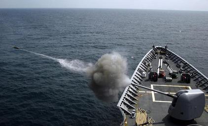 | Keywords: 5450841935 41a2459189 o.jpg en The guided-missile cruiser USS Vella Gulf CG 72 fires a 5-inch MK-45 Mod 2 light-weight gun during a live fire exercise during Joint Task Force Exercise JTFEX 08-4 as a part of the Iwo Jima Expeditionary Strike Group 2008-07-27 http //www flickr com/photos/usnavy/5450841935/in/photostream/ U S Navy photo by Mass Communication Specialist Seaman Chad R Erdmann PD-USN 5 /54 caliber Mark 45 gun firing Uploaded with UploadWizard USS Vella Gulf CG-72 Iwo Jima Expeditionary Strike Group |