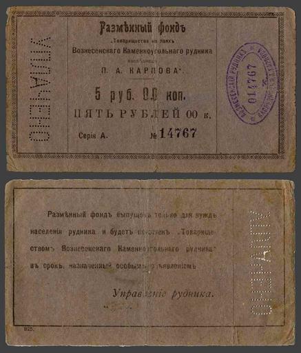| Keywords: Вознесенский рудник. 5 рублей (2).jpg Юзовка Разменный денежный знак това ищества на паях Вознесенского каменноугольного удника наследниц П А Ка пова 5 ублей http //forum gp dn ua/viewtopic php f 28 t 952 sid a2c8198a8c0277c6542008ec0ed5a590 Выпуск собственных бон нужно видимо отнести к началу 1918 года Author PD-RusEmpire Money of Donetsk Moneys uploaded by Andrew Butko from various sources Donetsk in the unidentified decade Historical non-photos images of Donetsk by alphabet Images from forum gp dn ua Banknotes with a face value of 5 |
