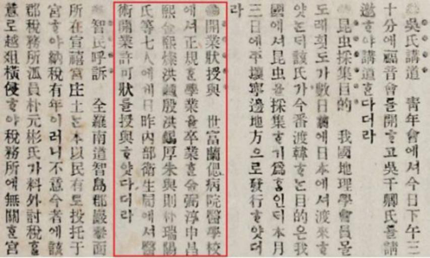 | Keywords: 박서양, 신창희 외 5명 의사면허 수여 보도.jpg 박 양 신창 외 5명에게 사면허 수여를 보도 기사 세 世富蘭偲 병원 학교에셔 정 학업 졸업 필 신창 영 홍종 홍 후 주현측 박 양 씨 등 7 에게 작 日昨 내 국에셔 술 업허 장 수여하얏다 http //www pressian com/article/article asp article_num 50101216080334 토 결탁 에비슨 7人 사 탄 비 1908-06-07 author PD-old People of Korea Joseon Dynasty PD-old-100 |