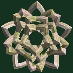 | Keywords: mathematica 3d cg parametricplot3d texture torus code program algorithm プログラム コード アルゴリズム 輪環 りんかん ドーナツ どーなつ 六芒星 ろくぼうせい geometric sculpture geometricsculpture shape geometry sculpture mapping テクスチャ マッピング 模様 もよう abstract 抽象 ちゅうしょう アブストラクト design pattern デザイン パターン graphic グラフィック グラフィクス structure 意匠 構造 symmetry 対称性 たいしょうせい シンメトリー 対称 たいしょう indoor a = 6; (* center hole size *) b = 6; (* hexa-torus *) c = 2; (* distance from the center of rotation *) d = 5; (* number of torus *) h = 3; (* height of a torus *) SetOptions[ParametricPlot3D, PlotRange -> Full, Mesh -> None, Boxed -> False, Axes -> False, PlotPoints -> 400, ImageSize -> 3000, Background -> RGBColor[{20, 50, 30}/255], PlotStyle -> Directive[Specularity[White, 40], Texture[Import["D:/tmp/862.jpg"]]], TextureCoordinateFunction -> ({#4 + #5, #5 / Pi} &), Lighting -> "Neutral"]; f[v_] := TriangleWave[{-1, 1}, v/(2 Pi)]; g[v_] := TriangleWave[{-1, 1}, v/(2 Pi) + 1/4]; x = (a - g[t] - f[b s]) Cos[s] + c; y = (a - g[t] - f[b s]) Sin[s] + c; z = (a - f[t] - h f[b s]); rm = Table[{x, y, z}.RotationMatrix[2 i Pi/d, {0, 0, 1}], {i, d}]; ParametricPlot3D[rm, {t, 0, 2 Pi}, {s, 0, Pi}] (*--- The Texture *) a = 6; (* center hole size *) b = 6; (* hexa-torus *) c = 2; (* distance from the center of rotation *) d = 5; (* number of torus *) h = 3; (* height of a torus *) SetOptions[ParametricPlot3D, PlotRange -> Full, Mesh -> None, Boxed -> False, Axes -> False, PlotPoints -> 400, ImageSize -> 3000, Background -> RGBColor[{20, 50, 30}/255], PlotStyle -> Directive[Specularity[White, 40], Texture[Import["D:/tmp/862.jpg"]]], TextureCoordinateFunction -> ({#4 + #5, #5 / Pi} &), Lighting -> "Neutral"]; f[v_] := TriangleWave[{-1, 1}, v/(2 Pi)]; g[v_] := TriangleWave[{-1, 1}, v/(2 Pi) + 1/4]; x = (a - g[t] - f[b s]) Cos[s] + c; y = (a - g[t] - f[b s]) Sin[s] + c; z = (a - f[t] - h f[b s]); rm = Table[{x, y, z}.RotationMatrix[2 i Pi/d, {0, 0, 1}], {i, d}]; ParametricPlot3D[rm, {t, 0, 2 Pi}, {s, 0, Pi}] (*--- The Texture *) |