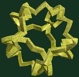 | Keywords: mathematica 3d cg parametricplot3d texture torus code program algorithm プログラム コード アルゴリズム 輪環 りんかん ドーナツ どーなつ 八芒星 はちぼうせい geometric sculpture geometricsculpture shape geometry sculpture mapping テクスチャ マッピング 模様 もよう abstract 抽象 ちゅうしょう アブストラクト design pattern デザイン パターン graphic グラフィック グラフィクス structure 意匠 構造 symmetry 対称性 たいしょうせい シンメトリー 対称 たいしょう plant foliage leaf ancient organic pattern outdoor black background tree a = 8; (* center hole size *) b = 8; (* octa-torus *) c = -1; (* distance from the center of rotation *) d = 5; (* number of torus *) h = 1; (* height of a torus *) SetOptions[ParametricPlot3D, PlotRange -> Full, Mesh -> None, Boxed -> False, Axes -> False, PlotPoints -> 400, ImageSize -> 3000, Background -> RGBColor[{20, 50, 30}/255], PlotStyle -> Directive[Specularity[White, 30], Texture[Import["D:/tmp/71.jpg"]]], TextureCoordinateFunction -> ({#4, #5 Pi} &), Lighting -> "Neutral"]; f[v_] := TriangleWave[{-1, 1}, v/(2 Pi)]; g[v_] := TriangleWave[{-1, 1}, v/(2 Pi) + 1/4]; x = (a - g[t] - f[b s]) Cos[s + Pi/(2 b)]; y = (a - g[t] - f[b s]) Sin[s + Pi/(2 b)]; z = (a - f[t] - h f[b s]) + c; rm = Table[{x, y, z}.RotationMatrix[2 i Pi/d, {1, 1, 0}], {i, d}]; ParametricPlot3D[rm, {t, 0, 2 Pi}, {s, 0, Pi}] (*--- The Texture *) a = 8; (* center hole size *) b = 8; (* octa-torus *) c = -1; (* distance from the center of rotation *) d = 5; (* number of torus *) h = 1; (* height of a torus *) SetOptions[ParametricPlot3D, PlotRange -> Full, Mesh -> None, Boxed -> False, Axes -> False, PlotPoints -> 400, ImageSize -> 3000, Background -> RGBColor[{20, 50, 30}/255], PlotStyle -> Directive[Specularity[White, 30], Texture[Import["D:/tmp/71.jpg"]]], TextureCoordinateFunction -> ({#4, #5 Pi} &), Lighting -> "Neutral"]; f[v_] := TriangleWave[{-1, 1}, v/(2 Pi)]; g[v_] := TriangleWave[{-1, 1}, v/(2 Pi) + 1/4]; x = (a - g[t] - f[b s]) Cos[s + Pi/(2 b)]; y = (a - g[t] - f[b s]) Sin[s + Pi/(2 b)]; z = (a - f[t] - h f[b s]) + c; rm = Table[{x, y, z}.RotationMatrix[2 i Pi/d, {1, 1, 0}], {i, d}]; ParametricPlot3D[rm, {t, 0, 2 Pi}, {s, 0, Pi}] (*--- The Texture *) |