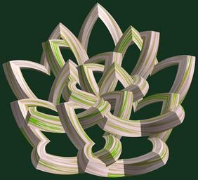 | Keywords: mathematica 3d cg parametricplot3d texture torus code program algorithm プログラム コード アルゴリズム 輪環 りんかん ドーナツ どーなつ 五芒星 ごぼうせい geometric sculpture geometricsculpture shape geometry sculpture abstract 抽象 ちゅうしょう アブストラクト design pattern デザイン パターン graphic グラフィック グラフィクス structure 意匠 構造 symmetry 対称性 たいしょうせい シンメトリー 対称 たいしょう black background a = 5; (* center hole size *) b = 5; (* penta-torus *) c = 3; (* distance from the center of rotation *) d = 5; (* number of torus *) h = 2; (* height of a torus *) SetOptions[ParametricPlot3D, PlotRange -> Full, Mesh -> None, Boxed -> False, Axes -> False, PlotPoints -> 400, ImageSize -> 3000, Background -> RGBColor[{20, 50, 30}/255], PlotStyle -> Directive[Specularity[White, 70], Texture[Import["D:/tmp/862.jpg"]]], TextureCoordinateFunction -> ({#4 + #5, #5 / Pi} &), Lighting -> "Neutral"]; f[v_] := TriangleWave[{-1, 1}, v/(2 Pi)]; g[v_] := TriangleWave[{-1, 1}, v/(2 Pi) + 1/4]; x = (a - g[t] - f[b s]) Cos[s] + c; y = (a - g[t] - f[b s]) Sin[s] + c; z = (a - f[t] - h f[b s]); rm = Table[{x, y, z}.RotationMatrix[2 i Pi/d, {0, 0, 1}], {i, d}]; ParametricPlot3D[rm, {t, 0, 2 Pi}, {s, 0, Pi}] (*--- The Texture *) a = 5; (* center hole size *) b = 5; (* penta-torus *) c = 3; (* distance from the center of rotation *) d = 5; (* number of torus *) h = 2; (* height of a torus *) SetOptions[ParametricPlot3D, PlotRange -> Full, Mesh -> None, Boxed -> False, Axes -> False, PlotPoints -> 400, ImageSize -> 3000, Background -> RGBColor[{20, 50, 30}/255], PlotStyle -> Directive[Specularity[White, 70], Texture[Import["D:/tmp/862.jpg"]]], TextureCoordinateFunction -> ({#4 + #5, #5 / Pi} &), Lighting -> "Neutral"]; f[v_] := TriangleWave[{-1, 1}, v/(2 Pi)]; g[v_] := TriangleWave[{-1, 1}, v/(2 Pi) + 1/4]; x = (a - g[t] - f[b s]) Cos[s] + c; y = (a - g[t] - f[b s]) Sin[s] + c; z = (a - f[t] - h f[b s]); rm = Table[{x, y, z}.RotationMatrix[2 i Pi/d, {0, 0, 1}], {i, d}]; ParametricPlot3D[rm, {t, 0, 2 Pi}, {s, 0, Pi}] (*--- The Texture *) |