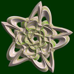 | Keywords: mathematica 3d cg parametricplot3d texture torus 輪環 りんかん ドーナツ どーなつ 五芒星 ごぼうせい 五光星 ごこうせい 五稜星 ごりょうせい program プログラム code コード algorithm コード アルゴリズム pentagram geometric sculpture geometricsculpture shape geometry sculpture mapping テクスチャ マッピング 模様 もよう design pattern デザイン パターン graphic グラフィック グラフィクス structure 意匠 構造 symmetry 対称性 たいしょうせい シンメトリー 対称 たいしょう algorithm tangle black background organic pattern SetOptions[ParametricPlot3D, PlotRange -> Full, Mesh -> None, Boxed -> False, Axes -> None, PlotPoints -> 400, ImageSize -> 3000, Background -> Darker[Green, 0.8], PlotStyle -> Directive[Specularity[White, 30], Texture[Import["D:/tmp/862.jpg"]]], TextureCoordinateFunction -> ({#4 + #5, #5/Pi} &), Lighting -> "Neutral"]; a = 3; (* center hole size of a torus *) b = 5; (* penta-torus *) c = 1; (* distance from the center of rotation *) d = 5; (* number of torus *) f[v_] := TriangleWave[{-1, 1}, v/(2 Pi)]; g[v_] := TriangleWave[{-1, 1}, v/(2 Pi) + 1/4]; x = (a - g[t] - Sin[b s]) g[s + Pi/10] + c; y = f[t] + c; z = (a - g[t] - Sin[b s]) f[s + Pi/10] + c; rot = Table[{x, y, z}.RotationMatrix[i Pi/d, {0, 1, 0}], {i, d}]; ParametricPlot3D[rot, {t, 0, 2 Pi}, {s, 0, 2 Pi}] (* --- The Texture is another color version of this: www.flickr.com/photos/tanaka_juuyoh/5412528282 *) SetOptions[ParametricPlot3D, PlotRange -> Full, Mesh -> None, Boxed -> False, Axes -> None, PlotPoints -> 400, ImageSize -> 3000, Background -> Darker[Green, 0.8], PlotStyle -> Directive[Specularity[White, 30], Texture[Import["D:/tmp/862.jpg"]]], TextureCoordinateFunction -> ({#4 + #5, #5/Pi} &), Lighting -> "Neutral"]; a = 3; (* center hole size of a torus *) b = 5; (* penta-torus *) c = 1; (* distance from the center of rotation *) d = 5; (* number of torus *) f[v_] := TriangleWave[{-1, 1}, v/(2 Pi)]; g[v_] := TriangleWave[{-1, 1}, v/(2 Pi) + 1/4]; x = (a - g[t] - Sin[b s]) g[s + Pi/10] + c; y = f[t] + c; z = (a - g[t] - Sin[b s]) f[s + Pi/10] + c; rot = Table[{x, y, z}.RotationMatrix[i Pi/d, {0, 1, 0}], {i, d}]; ParametricPlot3D[rot, {t, 0, 2 Pi}, {s, 0, 2 Pi}] (* --- The Texture is another color version of this: www.flickr.com/photos/tanaka_juuyoh/5412528282 *) |