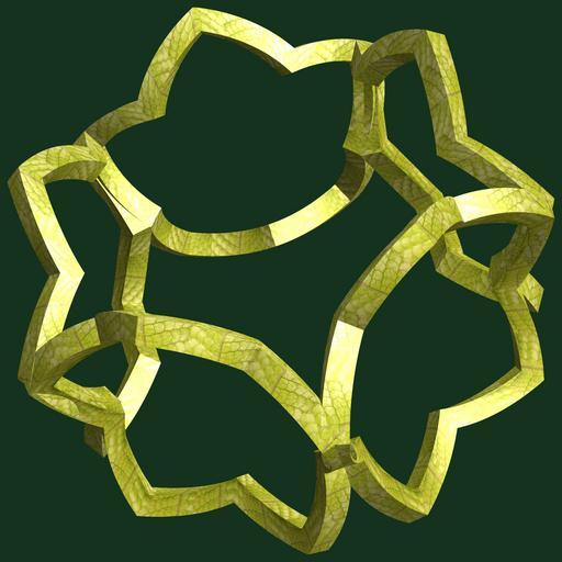 Keywords: mathematica 3d cg parametricplot3d texture torus code program algorithm プログラム コード アルゴリズム 輪環 りんかん ドーナツ どーなつ 五芒星 ごぼうせい geometric sculpture geometricsculpture shape geometry sculpture mapping テクスチャ マッピング 模様 もよう abstract 抽象 ちゅうしょう アブストラクト design pattern デザイン パターン graphic グラフィック グラフィクス structure 意匠 構造 symmetry 対称性 たいしょうせい シンメトリー 対称 たいしょう black background curve ancient foliage plant a = 8; (* center hole size *) b = 5; (* penta-torus *) c = 3; (* distance from the center of rotation *) d = 5; (* number of torus *) h = 1; (* height of a torus *) SetOptions[ParametricPlot3D, PlotRange -> Full, Mesh -> None, Boxed -> False, Axes -> False, PlotPoints -> 400, ImageSize -> 3000, Background -> RGBColor[{20, 50, 30}/255], PlotStyle -> Directive[Specularity[White, 30], Texture[Import["D:/tmp/71.jpg"]]], TextureCoordinateFunction -> ({#4, #5 Pi} &), Lighting -> "Neutral"]; f[v_] := TriangleWave[{-1, 1}, v/(2 Pi)]; g[v_] := TriangleWave[{-1, 1}, v/(2 Pi) + 1/4]; x = (a - g[t] - f[b s]) Cos[s + 3 Pi/(4 b)]; y = (a - g[t] - f[b s]) Sin[s + 3 Pi/(4 b)]; z = (a - f[t] - h f[b s]) + c; rm = Table[{x, y, z}.RotationMatrix[2 i Pi/d, {1, 1, 0}], {i, d}]; ParametricPlot3D[rm, {t, 0, 2 Pi}, {s, 0, Pi}] (*--- The Texture *) a = 8; (* center hole size *) b = 5; (* penta-torus *) c = 3; (* distance from the center of rotation *) d = 5; (* number of torus *) h = 1; (* height of a torus *) SetOptions[ParametricPlot3D, PlotRange -> Full, Mesh -> None, Boxed -> False, Axes -> False, PlotPoints -> 400, ImageSize -> 3000, Background -> RGBColor[{20, 50, 30}/255], PlotStyle -> Directive[Specularity[White, 30], Texture[Import["D:/tmp/71.jpg"]]], TextureCoordinateFunction -> ({#4, #5 Pi} &), Lighting -> "Neutral"]; f[v_] := TriangleWave[{-1, 1}, v/(2 Pi)]; g[v_] := TriangleWave[{-1, 1}, v/(2 Pi) + 1/4]; x = (a - g[t] - f[b s]) Cos[s + 3 Pi/(4 b)]; y = (a - g[t] - f[b s]) Sin[s + 3 Pi/(4 b)]; z = (a - f[t] - h f[b s]) + c; rm = Table[{x, y, z}.RotationMatrix[2 i Pi/d, {1, 1, 0}], {i, d}]; ParametricPlot3D[rm, {t, 0, 2 Pi}, {s, 0, Pi}] (*--- The Texture *)