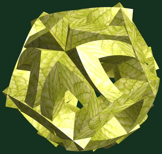 Keywords: mathematica 3d cg parametricplot3d texture torus code program algorithm プログラム コード アルゴリズム 輪環 りんかん ドーナツ どーなつ 五芒星 ごぼうせい geometric sculpture geometricsculpture shape geometry sculpture mapping テクスチャ マッピング 模様 もよう abstract 抽象 ちゅうしょう アブストラクト design pattern デザイン パターン graphic グラフィック グラフィクス structure 意匠 構造 symmetry 対称性 たいしょうせい シンメトリー 対称 たいしょう leaf plant foliage outdoor a = 3; (* center hole size *) b = 5; (* penta-torus *) c = -5; (* distance from the center of rotation *) d = 5; (* number of torus *) h = 1; (* height of a torus *) SetOptions[ParametricPlot3D, PlotRange -> Full, Mesh -> None, Boxed -> False, Axes -> False, PlotPoints -> 400, ImageSize -> 3000, Background -> RGBColor[{20, 50, 30}/255], PlotStyle -> Directive[Specularity[White, 30], Texture[Import["D:/tmp/71.jpg"]]], TextureCoordinateFunction -> ({#4, #5 Pi} &), Lighting -> "Neutral"]; f[v_] := TriangleWave[{-1, 1}, v/(2 Pi)]; g[v_] := TriangleWave[{-1, 1}, v/(2 Pi) + 1/4]; x = (a - g[t] - f[b s]) Cos[s + 3 Pi/(4 b)]; y = (a - g[t] - f[b s]) Sin[s + 3 Pi/(4 b)]; z = (a - f[t] - h f[b s]) + c; rm = Table[{x, y, z}.RotationMatrix[2 i Pi/d, {1, 1, 0}], {i, d}]; ParametricPlot3D[rm, {t, 0, 2 Pi}, {s, 0, Pi}] (*--- The Texture *) a = 3; (* center hole size *) b = 5; (* penta-torus *) c = -5; (* distance from the center of rotation *) d = 5; (* number of torus *) h = 1; (* height of a torus *) SetOptions[ParametricPlot3D, PlotRange -> Full, Mesh -> None, Boxed -> False, Axes -> False, PlotPoints -> 400, ImageSize -> 3000, Background -> RGBColor[{20, 50, 30}/255], PlotStyle -> Directive[Specularity[White, 30], Texture[Import["D:/tmp/71.jpg"]]], TextureCoordinateFunction -> ({#4, #5 Pi} &), Lighting -> "Neutral"]; f[v_] := TriangleWave[{-1, 1}, v/(2 Pi)]; g[v_] := TriangleWave[{-1, 1}, v/(2 Pi) + 1/4]; x = (a - g[t] - f[b s]) Cos[s + 3 Pi/(4 b)]; y = (a - g[t] - f[b s]) Sin[s + 3 Pi/(4 b)]; z = (a - f[t] - h f[b s]) + c; rm = Table[{x, y, z}.RotationMatrix[2 i Pi/d, {1, 1, 0}], {i, d}]; ParametricPlot3D[rm, {t, 0, 2 Pi}, {s, 0, Pi}] (*--- The Texture *)