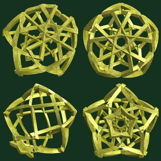 | Keywords: mathematica 3d cg parametricplot3d texture torus code program algorithm プログラム コード アルゴリズム 輪環 りんかん ドーナツ どーなつ 五芒星 ごぼうせい geometric sculpture geometricsculpture shape geometry sculpture mapping テクスチャ マッピング 模様 もよう abstract 抽象 ちゅうしょう アブストラクト design pattern デザイン パターン graphic グラフィック グラフィクス structure 意匠 構造 symmetry 対称性 たいしょうせい シンメトリー 対称 たいしょう tangle black background indoor curve a = 12; (* center hole size *) b = 5; (* penta-torus *) c = -11; (* distance from the center of rotation *) d = 5; (* number of torus *) h = 4; (* height of a torus *) SetOptions[ParametricPlot3D, PlotRange -> Full, Mesh -> None, Boxed -> False, Axes -> False, PlotPoints -> 400, ImageSize -> 3000, Background -> RGBColor[{20, 50, 30}/255], PlotStyle -> Directive[Specularity[White, 30], Texture[Import["D:/tmp/71.jpg"]]], TextureCoordinateFunction -> ({#4, #5 Pi} &), Lighting -> "Neutral"]; f[v_] := TriangleWave[{-1, 1}, v/(2 Pi)]; g[v_] := TriangleWave[{-1, 1}, v/(2 Pi) + 1/4]; x = (a - g[t] - f[b s]) Cos[s + 3 Pi/(4 b)]; y = (a - g[t] - f[b s]) Sin[s + 3 Pi/(4 b)]; z = (a - f[t] - h f[b s]) + c; rm = Table[{x, y, z}.RotationMatrix[2 i Pi/d, {1, 1, 0}], {i, d}]; ParametricPlot3D[rm, {t, 0, 2 Pi}, {s, 0, Pi}] (*--- The Texture *) a = 12; (* center hole size *) b = 5; (* penta-torus *) c = -11; (* distance from the center of rotation *) d = 5; (* number of torus *) h = 4; (* height of a torus *) SetOptions[ParametricPlot3D, PlotRange -> Full, Mesh -> None, Boxed -> False, Axes -> False, PlotPoints -> 400, ImageSize -> 3000, Background -> RGBColor[{20, 50, 30}/255], PlotStyle -> Directive[Specularity[White, 30], Texture[Import["D:/tmp/71.jpg"]]], TextureCoordinateFunction -> ({#4, #5 Pi} &), Lighting -> "Neutral"]; f[v_] := TriangleWave[{-1, 1}, v/(2 Pi)]; g[v_] := TriangleWave[{-1, 1}, v/(2 Pi) + 1/4]; x = (a - g[t] - f[b s]) Cos[s + 3 Pi/(4 b)]; y = (a - g[t] - f[b s]) Sin[s + 3 Pi/(4 b)]; z = (a - f[t] - h f[b s]) + c; rm = Table[{x, y, z}.RotationMatrix[2 i Pi/d, {1, 1, 0}], {i, d}]; ParametricPlot3D[rm, {t, 0, 2 Pi}, {s, 0, Pi}] (*--- The Texture *) |