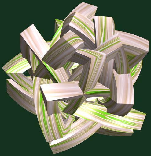 Keywords: mathematica 3d cg parametricplot3d texture torus code program algorithm tri-torus tritorus プログラム コード アルゴリズム 輪環 りんかん ドーナツ どーなつ 四芒星 しぼうせい geometric sculpture geometricsculpture shape geometry sculpture mapping テクスチャ マッピング 模様 もよう abstract 抽象 ちゅうしょう アブストラクト design pattern デザイン パターン graphic グラフィック グラフィクス structure 意匠 構造 symmetry 対称性 たいしょうせい シンメトリー 対称 たいしょう a = 4; (* center hole size *) b = 4; (* tetra-torus *) c = 3; (* distance from the center of rotation *) d = 5; (* number of torus *) h = 2; (* height of a torus *) SetOptions[ParametricPlot3D, PlotRange -> Full, Mesh -> None, Boxed -> False, Axes -> False, PlotPoints -> 400, ImageSize -> 3000, Background -> RGBColor[{20, 50, 30}/255], PlotStyle -> Directive[Specularity[White, 70], Texture[Import["D:/tmp/862.jpg"]]], TextureCoordinateFunction -> ({#4 + #5, #5 / Pi} &), Lighting -> "Neutral"]; f[v_] := TriangleWave[{-1, 1}, v/(2 Pi)]; g[v_] := TriangleWave[{-1, 1}, v/(2 Pi) + 1/4]; x = (a - g[t] - f[b s]) Cos[s] + c; y = (a - g[t] - f[b s]) Sin[s] + c; z = (a - f[t] - h f[b s]); rm = Table[{x, y, z}.RotationMatrix[2 i Pi/d, {1, 1, 1}], {i, d}]; ParametricPlot3D[rm, {t, 0, 2 Pi}, {s, 0, 2 Pi}] (*--- The Texture *) a = 4; (* center hole size *) b = 4; (* tetra-torus *) c = 3; (* distance from the center of rotation *) d = 5; (* number of torus *) h = 2; (* height of a torus *) SetOptions[ParametricPlot3D, PlotRange -> Full, Mesh -> None, Boxed -> False, Axes -> False, PlotPoints -> 400, ImageSize -> 3000, Background -> RGBColor[{20, 50, 30}/255], PlotStyle -> Directive[Specularity[White, 70], Texture[Import["D:/tmp/862.jpg"]]], TextureCoordinateFunction -> ({#4 + #5, #5 / Pi} &), Lighting -> "Neutral"]; f[v_] := TriangleWave[{-1, 1}, v/(2 Pi)]; g[v_] := TriangleWave[{-1, 1}, v/(2 Pi) + 1/4]; x = (a - g[t] - f[b s]) Cos[s] + c; y = (a - g[t] - f[b s]) Sin[s] + c; z = (a - f[t] - h f[b s]); rm = Table[{x, y, z}.RotationMatrix[2 i Pi/d, {1, 1, 1}], {i, d}]; ParametricPlot3D[rm, {t, 0, 2 Pi}, {s, 0, 2 Pi}] (*--- The Texture *)