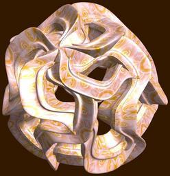| Keywords: mathematica 3d cg parametricplot3d texture torus 輪環 りんかん ドーナツ どーなつ 四芒星 しぼうせい 四光星 しこうせい 四稜星 しりょうせい code program algorithm コード プログラム アルゴリズム geometric sculpture geometricsculpture shape geometry sculpture mapping テクスチャ マッピング 模様 もよう abstract 抽象 ちゅうしょう アブストラクト design pattern デザイン パターン graphic グラフィック グラフィクス structure 意匠 構造 symmetry 対称性 たいしょうせい シンメトリー 対称 たいしょう algorithm コード indoor surreal black background a = 5; (* center hole size of a torus *) b = 4; (* tetra-torus *) c = 8; (* distance from the center of rotation *) d = 5; (* number of torus *) h = 1; (* height of a torus *) SetOptions[ParametricPlot3D, PlotRange -> Full, Mesh -> None, Boxed -> False, Axes -> False, PlotPoints -> 400, ImageSize -> 3000, Background -> Darker[Orange, 0.8], PlotStyle -> Directive[Specularity[White, 30], Texture[Import["D:/tmp/861.jpg"]]], TextureCoordinateFunction -> ({#4, #5 2 Pi} &), Lighting -> "Neutral"]; f[v_] := Sin[2 Sin[Sin[Sin[v]]]]; g[v_] := Sum[Cos[(2 k - 1) v]/(2 k - 1), {k, 4}]; x = (a - g[t] - f[b s]) Cos[s + 3 Pi/(4 b)] + c; y = (a - g[t] - f[b s]) Sin[s + 3 Pi/(4 b)] + c; z = (a - Sin[t] - h f[b s]); rot = Table[{x, y, z}.RotationMatrix[2 i Pi/d, {1, 1, 1}], {i, d}]; ParametricPlot3D[rot, {t, 0, 2 Pi}, {s, 0, 2 Pi}] (*--- The Texture *) a = 5; (* center hole size of a torus *) b = 4; (* tetra-torus *) c = 8; (* distance from the center of rotation *) d = 5; (* number of torus *) h = 1; (* height of a torus *) SetOptions[ParametricPlot3D, PlotRange -> Full, Mesh -> None, Boxed -> False, Axes -> False, PlotPoints -> 400, ImageSize -> 3000, Background -> Darker[Orange, 0.8], PlotStyle -> Directive[Specularity[White, 30], Texture[Import["D:/tmp/861.jpg"]]], TextureCoordinateFunction -> ({#4, #5 2 Pi} &), Lighting -> "Neutral"]; f[v_] := Sin[2 Sin[Sin[Sin[v]]]]; g[v_] := Sum[Cos[(2 k - 1) v]/(2 k - 1), {k, 4}]; x = (a - g[t] - f[b s]) Cos[s + 3 Pi/(4 b)] + c; y = (a - g[t] - f[b s]) Sin[s + 3 Pi/(4 b)] + c; z = (a - Sin[t] - h f[b s]); rot = Table[{x, y, z}.RotationMatrix[2 i Pi/d, {1, 1, 1}], {i, d}]; ParametricPlot3D[rot, {t, 0, 2 Pi}, {s, 0, 2 Pi}] (*--- The Texture *) |