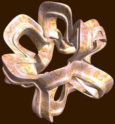 | Keywords: mathematica 3d cg parametricplot3d texture torus 輪環 りんかん ドーナツ どーなつ 三芒星 さんぼうせい 三光星 さんこうせい 三稜星 さんりょうせい code program algorithm コード プログラム アルゴリズム geometric sculpture geometricsculpture shape geometry sculpture mapping テクスチャ マッピング 模様 もよう abstract 抽象 ちゅうしょう アブストラクト design pattern デザイン パターン graphic グラフィック グラフィクス structure 意匠 構造 symmetry 対称性 たいしょうせい シンメトリー 対称 たいしょう algorithm コード black background surreal indoor a = 3; (* center hole size of a torus *) b = 3; (* tri-torus *) c = 1; (* distance from the center of rotation *) d = 5; (* number of torus *) h = 1; (* height of a torus *) SetOptions[ParametricPlot3D, PlotRange -> Full, Mesh -> None, Boxed -> False, Axes -> False, PlotPoints -> 400, ImageSize -> 3000, Background -> Darker[Orange, 0.8], PlotStyle -> Directive[Specularity[White, 30], Texture[Import["D:/tmp/861.jpg"]]], TextureCoordinateFunction -> ({#4, #5 2 Pi} &), Lighting -> "Neutral"]; f[v_] := Sin[2 Sin[Sin[Sin[v]]]]; g[v_] := Sum[Cos[(2 k - 1) v]/(2 k - 1), {k, 4}]; x = (a - g[t] - f[b s]) Cos[s] + c; y = (a - g[t] - f[b s]) Sin[s] + c; z = (a - Sin[t] - h f[b s]) + c; rot = Table[{x, y, z}.RotationMatrix[2 i Pi/d, {2, 1, 0}], {i, d}]; ParametricPlot3D[rot, {t, 0, 2 Pi}, {s, 0, 2 Pi}] (*--- The Texture *) a = 3; (* center hole size of a torus *) b = 3; (* tri-torus *) c = 1; (* distance from the center of rotation *) d = 5; (* number of torus *) h = 1; (* height of a torus *) SetOptions[ParametricPlot3D, PlotRange -> Full, Mesh -> None, Boxed -> False, Axes -> False, PlotPoints -> 400, ImageSize -> 3000, Background -> Darker[Orange, 0.8], PlotStyle -> Directive[Specularity[White, 30], Texture[Import["D:/tmp/861.jpg"]]], TextureCoordinateFunction -> ({#4, #5 2 Pi} &), Lighting -> "Neutral"]; f[v_] := Sin[2 Sin[Sin[Sin[v]]]]; g[v_] := Sum[Cos[(2 k - 1) v]/(2 k - 1), {k, 4}]; x = (a - g[t] - f[b s]) Cos[s] + c; y = (a - g[t] - f[b s]) Sin[s] + c; z = (a - Sin[t] - h f[b s]) + c; rot = Table[{x, y, z}.RotationMatrix[2 i Pi/d, {2, 1, 0}], {i, d}]; ParametricPlot3D[rot, {t, 0, 2 Pi}, {s, 0, 2 Pi}] (*--- The Texture *) |