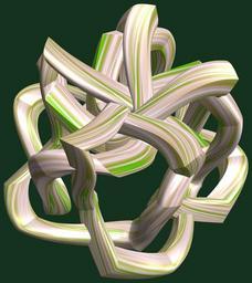 | Keywords: mathematica 3d cg parametricplot3d texture torus code program algorithm tri-torus tritorus プログラム コード アルゴリズム 輪環 りんかん ドーナツ どーなつ 三芒星 さんぼうせい geometric sculpture geometricsculpture shape geometry sculpture mapping テクスチャ マッピング 模様 もよう abstract 抽象 ちゅうしょう アブストラクト design pattern デザイン パターン graphic グラフィック グラフィクス structure 意匠 構造 symmetry 対称性 たいしょうせい シンメトリー 対称 たいしょう black background photo border a = 6; (* center hole size *) b = 3; (* tri-torus *) c = 3; (* distance from the center of rotation *) d = 5; (* number of torus *) h = 2; (* height of a torus *) SetOptions[ParametricPlot3D, PlotRange -> Full, Mesh -> None, Boxed -> False, Axes -> False, PlotPoints -> 300, ImageSize -> 2600, Background -> RGBColor[{20, 50, 30}/255], PlotStyle -> Directive[Specularity[White, 70], Texture[Import["D:/tmp/862.jpg"]]], TextureCoordinateFunction -> ({#4 + #5, #5 / Pi} &), Lighting -> "Neutral"]; f[v_] := TriangleWave[{-1, 1}, v/(2 Pi)]; g[v_] := TriangleWave[{-1, 1}, v/(2 Pi) + 1/4]; x = (a - g[t] - f[b s]) g[s] + c; y = (a - g[t] - f[b s]) f[s] + c; z = (a - Sin[t] - h Sin[b s]); rm = Table[{x, y, z}.RotationMatrix[2 i Pi/d, {1, 1, 1}], {i, d}]; ParametricPlot3D[rm, {t, 0, 2 Pi}, {s, 0, 2 Pi}] (*--- The Texture *) a = 6; (* center hole size *) b = 3; (* tri-torus *) c = 3; (* distance from the center of rotation *) d = 5; (* number of torus *) h = 2; (* height of a torus *) SetOptions[ParametricPlot3D, PlotRange -> Full, Mesh -> None, Boxed -> False, Axes -> False, PlotPoints -> 300, ImageSize -> 2600, Background -> RGBColor[{20, 50, 30}/255], PlotStyle -> Directive[Specularity[White, 70], Texture[Import["D:/tmp/862.jpg"]]], TextureCoordinateFunction -> ({#4 + #5, #5 / Pi} &), Lighting -> "Neutral"]; f[v_] := TriangleWave[{-1, 1}, v/(2 Pi)]; g[v_] := TriangleWave[{-1, 1}, v/(2 Pi) + 1/4]; x = (a - g[t] - f[b s]) g[s] + c; y = (a - g[t] - f[b s]) f[s] + c; z = (a - Sin[t] - h Sin[b s]); rm = Table[{x, y, z}.RotationMatrix[2 i Pi/d, {1, 1, 1}], {i, d}]; ParametricPlot3D[rm, {t, 0, 2 Pi}, {s, 0, 2 Pi}] (*--- The Texture *) |