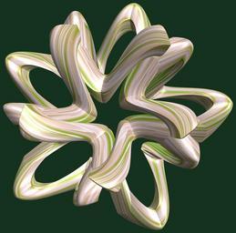| Keywords: mathematica 3d cg parametricplot3d texture torus code program algorithm tri-torus tritorus プログラム コード アルゴリズム 輪環 りんかん ドーナツ どーなつ 三芒星 さんぼうせい geometric sculpture geometricsculpture shape geometry sculpture mapping テクスチャ マッピング 模様 もよう abstract 抽象 ちゅうしょう アブストラクト design pattern デザイン パターン graphic グラフィック グラフィクス structure 意匠 構造 symmetry 対称性 たいしょうせい シンメトリー 対称 たいしょう black background organic pattern a = 3; (* center hole size *) b = 3; (* tri-torus *) c = -2; (* distance from the center of rotation *) d = 5; (* number of torus *) h = 2; (* height of a torus *) SetOptions[ParametricPlot3D, PlotRange -> Full, Mesh -> None, Boxed -> False, Axes -> False, PlotPoints -> 400, ImageSize -> 3000, Background -> RGBColor[{20, 50, 30}/255], PlotStyle -> Directive[Specularity[White, 70], Texture[Import["D:/tmp/862.jpg"]]], TextureCoordinateFunction -> ({#4 + #5, #5 / Pi} &), Lighting -> "Neutral"]; f[v_] := TriangleWave[{-1, 1}, v/(2 Pi)]; g[v_] := TriangleWave[{-1, 1}, v/(2 Pi) + 1/4]; x = (a - g[t] - f[b s]) g[s] + c; y = (a - g[t] - f[b s]) f[s] + c; z = (a - Sin[t] - h Sin[b s]); rm = Table[{x, y, z}.RotationMatrix[2 i Pi/d, {1, 1, 1}], {i, d}]; ParametricPlot3D[rm, {t, 0, 2 Pi}, {s, 0, 2 Pi}] (*--- The Texture *) a = 3; (* center hole size *) b = 3; (* tri-torus *) c = -2; (* distance from the center of rotation *) d = 5; (* number of torus *) h = 2; (* height of a torus *) SetOptions[ParametricPlot3D, PlotRange -> Full, Mesh -> None, Boxed -> False, Axes -> False, PlotPoints -> 400, ImageSize -> 3000, Background -> RGBColor[{20, 50, 30}/255], PlotStyle -> Directive[Specularity[White, 70], Texture[Import["D:/tmp/862.jpg"]]], TextureCoordinateFunction -> ({#4 + #5, #5 / Pi} &), Lighting -> "Neutral"]; f[v_] := TriangleWave[{-1, 1}, v/(2 Pi)]; g[v_] := TriangleWave[{-1, 1}, v/(2 Pi) + 1/4]; x = (a - g[t] - f[b s]) g[s] + c; y = (a - g[t] - f[b s]) f[s] + c; z = (a - Sin[t] - h Sin[b s]); rm = Table[{x, y, z}.RotationMatrix[2 i Pi/d, {1, 1, 1}], {i, d}]; ParametricPlot3D[rm, {t, 0, 2 Pi}, {s, 0, 2 Pi}] (*--- The Texture *) |
