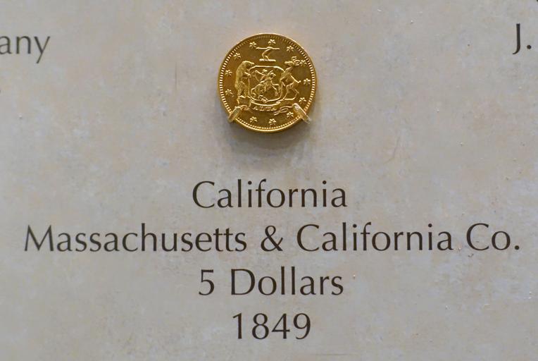 | Keywords: 5 Dollars, Massachusetts & California Co., California, 1849 - National Museum of American History - DSC00226.jpg en Exhibit in the National Museum of American History Washington DC USA Photography was permitted in the museum without restriction 2015-03-27 11 32 35 own Daderot other versions cc-zero Coins of the California Gold Rush in the National Museum of American History | ||||
