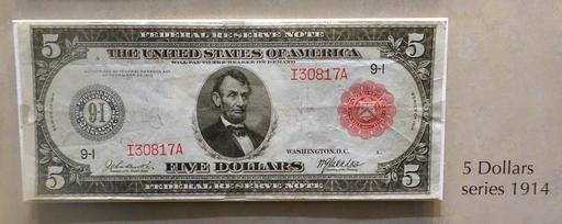 | Keywords: 5 Dollars, United States, series 1914 - National Museum of American History - DSC00318.jpg en Exhibit in the National Museum of American History Washington DC USA Photography was permitted in the museum without restriction 2015-03-27 11 44 42 own Daderot other versions PD-USGov-money cc-zero Banknotes in the National Museum of American History 5 United States dollar banknotes | ||||