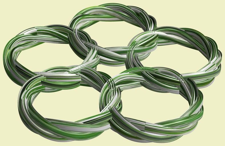 | Keywords: mathematica 3d cg parametricplot3d texture torus code program algorithm プログラム コード アルゴリズム 輪環 りんかん ドーナツ どーなつ トーラス とーらす knot 結び目 むすびめ mapping テクスチャ マッピング 模様 もよう design pattern デザイン パターン graphic グラフィック グラフィクス structure 意匠 構造 symmetry 対称性 たいしょうせい シンメトリー 対称 たいしょう indoor white background drawing cable a = 13; (* center hole size of a torus *) b1 = 9;(* the number of angles *) b2 = 4;(* the number of waves *) b3 = 4; (* the number of knots *) c = 14; (* distance from the center of rotation *) d = 5; (* the number of tori *) h1 = 1; (* width of a torus *) h2 = 1; (* width of a torus *) h3 = 2; (* height of cross *) SetOptions[ParametricPlot3D, PlotRange -> Full, Mesh -> None, Boxed -> False, Axes -> None, PlotPoints -> 500, ImageSize -> 3000, Background -> RGBColor[{240, 240, 200}/255], PlotStyle -> Directive[Specularity[White, 50], Texture[Import["D:/tmp/911.jpg"]]], TextureCoordinateFunction -> ({#4, #5 /Pi} &), Lighting -> "Neutral"]; x = (a - h1 Cos[t] + h2 Sin[b1 s]) Cos[b3 s] + c; y = (a - h1 Cos[t] + h2 Sin[b1 s]) Sin[b3 s] + c; z = h3 Cos[b1 s] + Sin[b2 t] + c; rm = Table[{x, y, z}.RotationMatrix[2 i Pi/d, {0, 0, 1}], {i, d}]; ParametricPlot3D[rm, {t, 0, 2 Pi}, {s, 0, 2 Pi}] (*--- The Texture *) a = 13; (* center hole size of a torus *) b1 = 9;(* the number of angles *) b2 = 4;(* the number of waves *) b3 = 4; (* the number of knots *) c = 14; (* distance from the center of rotation *) d = 5; (* the number of tori *) h1 = 1; (* width of a torus *) h2 = 1; (* width of a torus *) h3 = 2; (* height of cross *) SetOptions[ParametricPlot3D, PlotRange -> Full, Mesh -> None, Boxed -> False, Axes -> None, PlotPoints -> 500, ImageSize -> 3000, Background -> RGBColor[{240, 240, 200}/255], PlotStyle -> Directive[Specularity[White, 50], Texture[Import["D:/tmp/911.jpg"]]], TextureCoordinateFunction -> ({#4, #5 /Pi} &), Lighting -> "Neutral"]; x = (a - h1 Cos[t] + h2 Sin[b1 s]) Cos[b3 s] + c; y = (a - h1 Cos[t] + h2 Sin[b1 s]) Sin[b3 s] + c; z = h3 Cos[b1 s] + Sin[b2 t] + c; rm = Table[{x, y, z}.RotationMatrix[2 i Pi/d, {0, 0, 1}], {i, d}]; ParametricPlot3D[rm, {t, 0, 2 Pi}, {s, 0, 2 Pi}] (*--- The Texture *) |