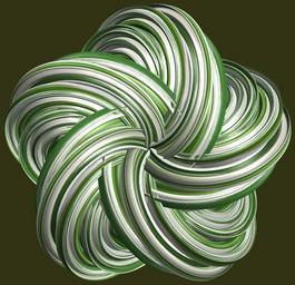 | Keywords: mathematica 3d cg parametricplot3d texture torus code program algorithm プログラム コード アルゴリズム 輪環 りんかん ドーナツ どーなつ トーラス とーらす knot 結び目 むすびめ mapping テクスチャ マッピング 模様 もよう design pattern デザイン パターン graphic グラフィック グラフィクス structure 意匠 構造 symmetry 対称性 たいしょうせい シンメトリー 対称 たいしょう indoor drawing organic pattern surreal black background abstract a = 8; (* center hole size of a torus *) b1 = 5; (* the number of angles *) b2 = 5; (* the number of waves *) b3 = 7; (* the number of knots *) c = 8; (* distance from the center of rotation *) d = 5; (* the number of tori *) h1 = 3; (* width of a torus *) h2 = 5; (* width of a torus *) h3 = 3; (* height of cross *) SetOptions[ParametricPlot3D, PlotRange -> Full, Mesh -> None, Boxed -> False, Axes -> None, PlotPoints -> 500, ImageSize -> 3000, Background -> RGBColor[{50, 50, 20}/255], PlotStyle -> Directive[Specularity[White, 50], Texture[Import["D:/tmp/911.jpg"]]], TextureCoordinateFunction -> ({#4, #5 /Pi} &), Lighting -> "Neutral"]; x = (a - h1 Cos[t] + h2 Sin[b1 s]) Cos[b3 s] + c; y = (a - h1 Cos[t] + h2 Sin[b1 s]) Sin[b3 s] + c; z = h3 Cos[b1 s] + Sin[b2 t] + c; rm = Table[{x, y, z}.RotationMatrix[2 i Pi/d, {1, 0, 1}], {i, d}]; ParametricPlot3D[rm, {t, 0, 2 Pi}, {s, 0, 2 Pi}] (*--- The Texture *) a = 8; (* center hole size of a torus *) b1 = 5; (* the number of angles *) b2 = 5; (* the number of waves *) b3 = 7; (* the number of knots *) c = 8; (* distance from the center of rotation *) d = 5; (* the number of tori *) h1 = 3; (* width of a torus *) h2 = 5; (* width of a torus *) h3 = 3; (* height of cross *) SetOptions[ParametricPlot3D, PlotRange -> Full, Mesh -> None, Boxed -> False, Axes -> None, PlotPoints -> 500, ImageSize -> 3000, Background -> RGBColor[{50, 50, 20}/255], PlotStyle -> Directive[Specularity[White, 50], Texture[Import["D:/tmp/911.jpg"]]], TextureCoordinateFunction -> ({#4, #5 /Pi} &), Lighting -> "Neutral"]; x = (a - h1 Cos[t] + h2 Sin[b1 s]) Cos[b3 s] + c; y = (a - h1 Cos[t] + h2 Sin[b1 s]) Sin[b3 s] + c; z = h3 Cos[b1 s] + Sin[b2 t] + c; rm = Table[{x, y, z}.RotationMatrix[2 i Pi/d, {1, 0, 1}], {i, d}]; ParametricPlot3D[rm, {t, 0, 2 Pi}, {s, 0, 2 Pi}] (*--- The Texture *) |