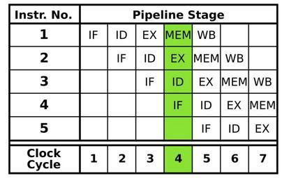 | Keywords: 5 Stage Pipeline.svg en A diagram showing the stage of execution reached by five consecutive instructions in a 5-stage microprocessor At clock cycle 4 the 1st instruction is in the memory access phase the second is in the execute phase the third in the instruction decode phase the fourth in the instruction fetch phase and the fifth hasn't been fetched yet own Inductiveload 2009-01-22 Pipeline diagrams computer science SVG flow charts | ||||