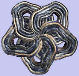 | Keywords: mathematica 3d cg parametricplot3d texture torus code program algorithm プログラム コード アルゴリズム 輪環 りんかん ドーナツ どーなつ トーラス とーらす mapping テクスチャ マッピング 模様 もよう abstract 抽象 ちゅうしょう アブストラクト design pattern デザイン パターン graphic グラフィック グラフィクス structure 意匠 構造 symmetry 対称性 たいしょうせい シンメトリー 対称 たいしょう drawing architecture door ancient surreal a = 7; (* center hole size of a torus *) b1 = 3;(* the number of angles *) b2 = 6;(* the number of waves *) c = 6; (* distance from the center of rotation *) d = 5; (* the number of tori *) h1 = 3; (* width of a torus *) h2 = 1; (* width of a torus *) SetOptions[ParametricPlot3D, PlotRange -> Full, Mesh -> None, Boxed -> False, Axes -> None, PlotPoints -> 500, ImageSize -> 3000, Background -> RGBColor[{200, 200, 240}/255], PlotStyle -> Directive[Specularity[White, 70], Texture[Import["D:/tmp/94.jpg"]]], TextureCoordinateFunction -> ({#4, #5 Pi} &), Lighting -> "Neutral"]; f[v_] := Sin[2 Sin[Sin[Sin[v]]]]; x = (a - h1 Cos[t] + h2 f[b1 s]) Cos[s] + c; y = (a - h1 Cos[t] + h2 f[b1 s]) Sin[s] + c; z = f[b2 t]; rm = Table[{x, y, z}.RotationMatrix[2 i Pi/d, {0, 1, 2}], {i, d}]; ParametricPlot3D[rm, {t, 0, 2 Pi}, {s, 0, 2 Pi}] (*--- The Texture *) a = 7; (* center hole size of a torus *) b1 = 3;(* the number of angles *) b2 = 6;(* the number of waves *) c = 6; (* distance from the center of rotation *) d = 5; (* the number of tori *) h1 = 3; (* width of a torus *) h2 = 1; (* width of a torus *) SetOptions[ParametricPlot3D, PlotRange -> Full, Mesh -> None, Boxed -> False, Axes -> None, PlotPoints -> 500, ImageSize -> 3000, Background -> RGBColor[{200, 200, 240}/255], PlotStyle -> Directive[Specularity[White, 70], Texture[Import["D:/tmp/94.jpg"]]], TextureCoordinateFunction -> ({#4, #5 Pi} &), Lighting -> "Neutral"]; f[v_] := Sin[2 Sin[Sin[Sin[v]]]]; x = (a - h1 Cos[t] + h2 f[b1 s]) Cos[s] + c; y = (a - h1 Cos[t] + h2 f[b1 s]) Sin[s] + c; z = f[b2 t]; rm = Table[{x, y, z}.RotationMatrix[2 i Pi/d, {0, 1, 2}], {i, d}]; ParametricPlot3D[rm, {t, 0, 2 Pi}, {s, 0, 2 Pi}] (*--- The Texture *) |
