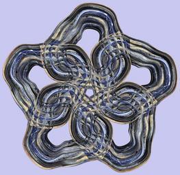 | Keywords: mathematica 3d cg parametricplot3d texture torus code program algorithm プログラム コード アルゴリズム 輪環 りんかん ドーナツ どーなつ トーラス とーらす mapping テクスチャ マッピング 模様 もよう abstract 抽象 ちゅうしょう アブストラクト design pattern デザイン パターン graphic グラフィック グラフィクス structure 意匠 構造 symmetry 対称性 たいしょうせい シンメトリー 対称 たいしょう indoor animal music brass instrument ancient white background a = 7; (* center hole size of a torus *) b1 = 3;(* the number of angles *) b2 = 6;(* the number of waves *) c = 7; (* distance from the center of rotation *) d = 5; (* the number of tori *) h1 = 3; (* width of a torus *) h2 = 1; (* width of a torus *) SetOptions[ParametricPlot3D, PlotRange -> Full, Mesh -> None, Boxed -> False, Axes -> None, PlotPoints -> 500, ImageSize -> 3000, Background -> RGBColor[{200, 200, 240}/255], PlotStyle -> Directive[Specularity[White, 70], Texture[Import["D:/tmp/94.jpg"]]], TextureCoordinateFunction -> ({#4, #5 Pi} &), Lighting -> "Neutral"]; f[v_] := Sin[2 Sin[Sin[Sin[v]]]]; x = (a - h1 Cos[t] + h2 f[b1 s]) Cos[s] + c; y = (a - h1 Cos[t] + h2 f[b1 s]) Sin[s] + c; z = f[b2 t]; rm = Table[{x, y, z}.RotationMatrix[2 i Pi/d, {1, 0, 0}], {i, d}]; ParametricPlot3D[rm, {t, 0, 2 Pi}, {s, 0, 2 Pi}] (*--- The Texture *) a = 7; (* center hole size of a torus *) b1 = 3;(* the number of angles *) b2 = 6;(* the number of waves *) c = 7; (* distance from the center of rotation *) d = 5; (* the number of tori *) h1 = 3; (* width of a torus *) h2 = 1; (* width of a torus *) SetOptions[ParametricPlot3D, PlotRange -> Full, Mesh -> None, Boxed -> False, Axes -> None, PlotPoints -> 500, ImageSize -> 3000, Background -> RGBColor[{200, 200, 240}/255], PlotStyle -> Directive[Specularity[White, 70], Texture[Import["D:/tmp/94.jpg"]]], TextureCoordinateFunction -> ({#4, #5 Pi} &), Lighting -> "Neutral"]; f[v_] := Sin[2 Sin[Sin[Sin[v]]]]; x = (a - h1 Cos[t] + h2 f[b1 s]) Cos[s] + c; y = (a - h1 Cos[t] + h2 f[b1 s]) Sin[s] + c; z = f[b2 t]; rm = Table[{x, y, z}.RotationMatrix[2 i Pi/d, {1, 0, 0}], {i, d}]; ParametricPlot3D[rm, {t, 0, 2 Pi}, {s, 0, 2 Pi}] (*--- The Texture *) |