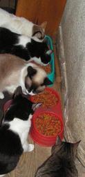 Keywords: 5Catseating.jpg en 5 Cats eating es 5 Gatos comiendo own Katze Canciola 11-11-08 Cat bowls Cats eating Groups of cats with varying coat colors