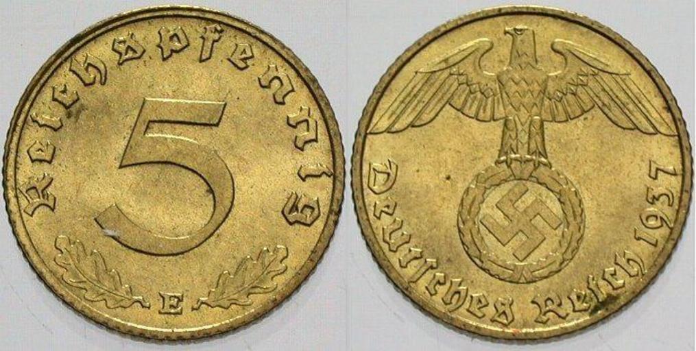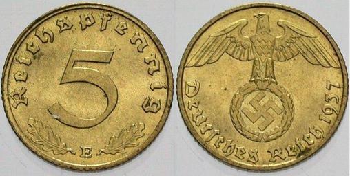 | Keywords: 5Reichspfennig1.JPG es Moneda de 5 pfennig Nazi German 5 pfennig 1/100 of a Reichsmark German coin Reichsbank photograph by Turkmenistan 1937 Coin PD-GermanGov-currency coin <br/>Photograph nazi symbol Reichsmark coins of the Third Reich 0005 1937 |