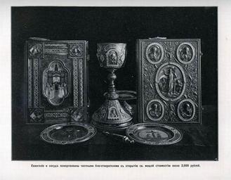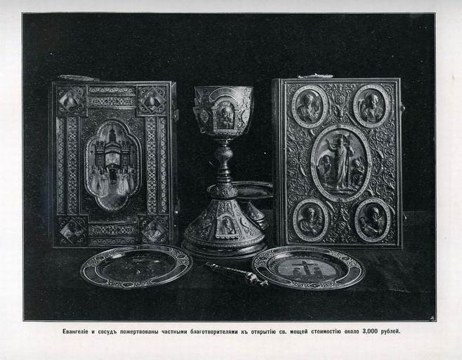 | Keywords: 61. Евангелие и сосуд пожертвованы частными благотворителями к открытию мощей преподобного Серфима.jpg ru Евангелие и сосуд поже твованы частными благотво ителями к отк ытию мощей п еподобного Се афима Стоимость ок 3000 ублей 1904 http //andcvet narod ru/arxan/24/sam html не указан other versions Custom license marker 2014 09 24 PD-RusEmpire Uploaded with UploadWizard Album of the Sarov Hermitage views 1904 | ||||