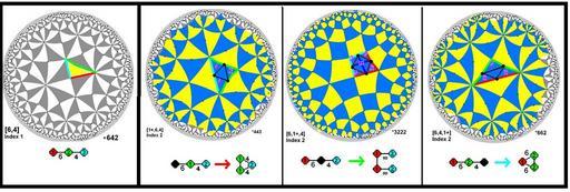 Keywords: 642 hyperbolic mirror removal examples.png Hyperbolic tiling 642 and subgroups by mirror removal Self 1/31/13 Tom Ruen Uniform dual tiling V 4-8-12 Uniform dual tiling V 6-8-8 Uniform dual tiling V 4-4-4-6 Uniform dual tiling V 4-12-12