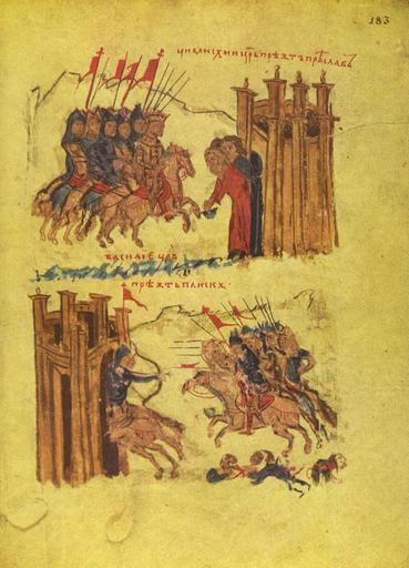 | Keywords: 65-manasses-chronicle.jpg   иниатю а 65 от  анасиевата летопис 14 век Завладяването на П еслав от Йоан Цимисхий и на Плиска от Василий II Miniature 65 from the Constantine Manasses Chronicle 14 century John I Tzimiskes conquers Preslav and Basil II conquers Pliska Скани ана от книгата  иниатю и на  анасиевата летопис Иван Дуйчев Издателство Бълга ски художник София 1962 Scanned from book Miniatures from the Manasses Chronicle Ivan Duichev Bulgarski hudojnik Publishing house Sofia 1962 Original 14 century Original Constantine Manasses PD-Art PD-Art-100 Constantine Manasses Chronicle Byzantine-Bulgarian Wars Ioannes I Tzimiskes Basileios II History of Veliki Preslav History of Pliska Cities of Bulgaria in art Veliki Preslav in art |