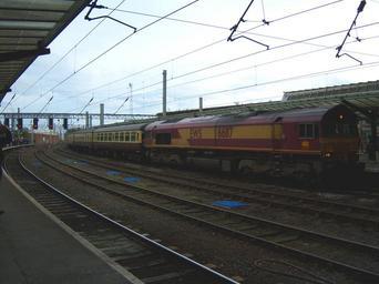 | Keywords: 66117 EWS Class 66 diesel locomotive Carlisle 10 Oct 2009.jpg  A w British Rail Class 66 Class 66 diesel locomotive No 66117 in English Welsh and Scottish Railway EWS colours hauls the coaching stock of the Cumbrian Mountain Tornado railtour into Platform 3 of Carlisle railway station from the sidings in readiness for No 60163 Tornado to couple to the other end and haul it on the return leg south having brought it north earlier in the day own 2009-10-10 Ultra7 Trains at Carlisle railway station 066117 British Rail Class 66/0s of DB Schenker Rail UK 66117 British Rail Class 66s in English Welsh and Scottish Railway livery 66117 British Rail Class 66s on the West Coast Main Line 66117 2009 in Carlisle 2009-10-10 00 00 00 October 2009 in Cumbria 2009-10-10 00 00 00 Charter trains of the United Kingdom Photographs taken on 2009-10-10 |