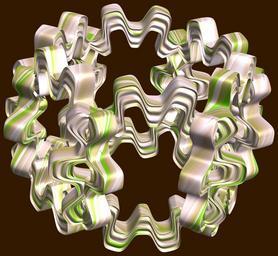 | Keywords: mathematica 3d cg parametricplot3d texture torus 輪環 りんかん ドーナツ どーなつ 十芒星 じゅうぼうせい 十光星 じゅうこうせい 十稜星 じゅうりょうせい プログラム コード code program algorithm コード アルゴリズム geometric sculpture geometricsculpture shape geometry sculpture mapping テクスチャ マッピング 模様 もよう design pattern デザイン パターン graphic グラフィック グラフィクス structure 意匠 構造 symmetry 対称性 たいしょうせい シンメトリー 対称 たいしょう algorithm plant black background flower bouquet collection photo border indoor SetOptions[ParametricPlot3D, PlotRange -> Full, Mesh -> None, Boxed -> False, Axes -> None, PlotPoints -> 400, ImageSize -> 3000, Background -> Darker[Orange, 0.8], PlotStyle -> Directive[Specularity[White, 30], Texture[Import["D:/tmp/862.jpg"]]], TextureCoordinateFunction -> ({#4 + #5, #5/Pi} &), Lighting -> "Neutral"]; a = 6; (* center hole size of a torus *) b = 10; (* deca-torus *) c = 8; (* distance from the center of rotation *) d = 6; (* number of torus *) f[v_] := Sin[2 Sin[Sin[Sin[v]]]]; x = (a - Cos[t] - f[b s]) Cos[s] + c; y = Sum[Sin[(2 k - 1) t]/(2 k - 1), {k, 4}] + c; z = (a - Cos[t] - f[b s]) Sin[s] + c; rot = Table[{x, y, z}.RotationMatrix[2 i Pi/d, {1, 0, 1}], {i, d}]; ParametricPlot3D[rot, {t, 0, 2 Pi}, {s, 0, 2 Pi}] (*--- The Texture is another color version of this: www.flickr.com/photos/tanaka_juuyoh/5412528282 The y is a 4-partial sum of the Fourier series for Square wave. yは矩形波のフーリエ展開の最初の4項 *) SetOptions[ParametricPlot3D, PlotRange -> Full, Mesh -> None, Boxed -> False, Axes -> None, PlotPoints -> 400, ImageSize -> 3000, Background -> Darker[Orange, 0.8], PlotStyle -> Directive[Specularity[White, 30], Texture[Import["D:/tmp/862.jpg"]]], TextureCoordinateFunction -> ({#4 + #5, #5/Pi} &), Lighting -> "Neutral"]; a = 6; (* center hole size of a torus *) b = 10; (* deca-torus *) c = 8; (* distance from the center of rotation *) d = 6; (* number of torus *) f[v_] := Sin[2 Sin[Sin[Sin[v]]]]; x = (a - Cos[t] - f[b s]) Cos[s] + c; y = Sum[Sin[(2 k - 1) t]/(2 k - 1), {k, 4}] + c; z = (a - Cos[t] - f[b s]) Sin[s] + c; rot = Table[{x, y, z}.RotationMatrix[2 i Pi/d, {1, 0, 1}], {i, d}]; ParametricPlot3D[rot, {t, 0, 2 Pi}, {s, 0, 2 Pi}] (*--- The Texture is another color version of this: www.flickr.com/photos/tanaka_juuyoh/5412528282 The y is a 4-partial sum of the Fourier series for Square wave. yは矩形波のフーリエ展開の最初の4項 *) |