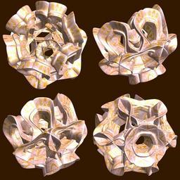 | Keywords: mathematica 3d cg parametricplot3d texture torus 輪環 りんかん ドーナツ どーなつ 五芒星 ごぼうせい 五光星 ごこうせい 五稜星 ごりょうせい code program algorithm コード プログラム アルゴリズム pentagram geometric sculpture geometricsculpture shape geometry sculpture mapping テクスチャ マッピング 模様 もよう abstract 抽象 ちゅうしょう アブストラクト design pattern デザイン パターン graphic グラフィック グラフィクス structure 意匠 構造 symmetry 対称性 たいしょうせい シンメトリー 対称 たいしょう algorithm コード black background indoor surreal photo border a = 4; (* center hole size of a torus *) b = 5; (* penta-torus *) c = 6; (* distance from the center of rotation *) d = 6; (* number of torus *) h = 1; (* height of a torus *) SetOptions[ParametricPlot3D, PlotRange -> Full, Mesh -> None, Boxed -> False, Axes -> False, PlotPoints -> 400, ImageSize -> 1600, Background -> Darker[Orange, 0.8], PlotStyle -> Directive[Specularity[White, 30], Texture[Import["D:/tmp/861.jpg"]]], TextureCoordinateFunction -> ({#4, #5 2 Pi} &), Lighting -> "Neutral"]; f[v_] := Sin[2 Sin[Sin[Sin[v]]]]; g[v_] := Sum[Cos[(2 k - 1) v]/(2 k - 1), {k, 4}]; x = (a - g[t] - f[b s]) Cos[s + 3 Pi/(4 b)] + c; y = (a - g[t] - f[b s]) Sin[s + 3 Pi/(4 b)] + c; z = (a - Sin[t] - h f[b s]); rot = Table[{x, y, z}.RotationMatrix[2 i Pi/d, {1, 1, 1}], {i, d}]; ParametricPlot3D[rot, {t, 0, 2 Pi}, {s, 0, 2 Pi}] (*--- The Texture *) a = 4; (* center hole size of a torus *) b = 5; (* penta-torus *) c = 6; (* distance from the center of rotation *) d = 6; (* number of torus *) h = 1; (* height of a torus *) SetOptions[ParametricPlot3D, PlotRange -> Full, Mesh -> None, Boxed -> False, Axes -> False, PlotPoints -> 400, ImageSize -> 1600, Background -> Darker[Orange, 0.8], PlotStyle -> Directive[Specularity[White, 30], Texture[Import["D:/tmp/861.jpg"]]], TextureCoordinateFunction -> ({#4, #5 2 Pi} &), Lighting -> "Neutral"]; f[v_] := Sin[2 Sin[Sin[Sin[v]]]]; g[v_] := Sum[Cos[(2 k - 1) v]/(2 k - 1), {k, 4}]; x = (a - g[t] - f[b s]) Cos[s + 3 Pi/(4 b)] + c; y = (a - g[t] - f[b s]) Sin[s + 3 Pi/(4 b)] + c; z = (a - Sin[t] - h f[b s]); rot = Table[{x, y, z}.RotationMatrix[2 i Pi/d, {1, 1, 1}], {i, d}]; ParametricPlot3D[rot, {t, 0, 2 Pi}, {s, 0, 2 Pi}] (*--- The Texture *) |