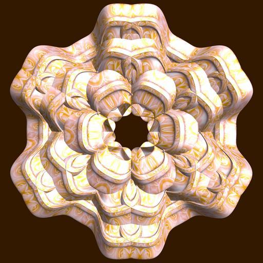 Keywords: mathematica 3d cg parametricplot3d texture torus 輪環 りんかん ドーナツ どーなつ 五芒星 ごぼうせい 五光星 ごこうせい 五稜星 ごりょうせい code program algorithm コード プログラム アルゴリズム pentagram geometric sculpture geometricsculpture shape geometry sculpture mapping テクスチャ マッピング 模様 もよう abstract 抽象 ちゅうしょう アブストラクト design pattern デザイン パターン graphic グラフィック グラフィクス structure 意匠 構造 symmetry 対称性 たいしょうせい シンメトリー 対称 たいしょう algorithm コード indoor black background a = 6; (* center hole size of a torus *) b = 5; (* penta-torus *) c = 2; (* distance from the center of rotation *) d = 6; (* number of torus *) h = 1; (* height of a torus *) SetOptions[ParametricPlot3D, PlotRange -> Full, Mesh -> None, Boxed -> False, Axes -> False, PlotPoints -> 400, ImageSize -> 3000, Background -> Darker[Orange, 0.8], PlotStyle -> Directive[Specularity[White, 30], Texture[Import["D:/tmp/861.jpg"]]], TextureCoordinateFunction -> ({#4, #5 2 Pi} &), Lighting -> "Neutral"]; f[v_] := Sin[2 Sin[Sin[Sin[v]]]]; g[v_] := Sum[Cos[(2 k - 1) v]/(2 k - 1), {k, 4}]; x = (a - g[t] - f[b s]) Cos[s + 3 Pi/(4 b)] + c; y = (a - g[t] - f[b s]) Sin[s + 3 Pi/(4 b)] + c; z = (a - Sin[t] - h f[b s]); rot = Table[{x, y, z}.RotationMatrix[2 i Pi/d, {0, 0, 1}], {i, d}]; ParametricPlot3D[rot, {t, 0, 2 Pi}, {s, 0, 2 Pi}] (*--- The Texture *) a = 6; (* center hole size of a torus *) b = 5; (* penta-torus *) c = 2; (* distance from the center of rotation *) d = 6; (* number of torus *) h = 1; (* height of a torus *) SetOptions[ParametricPlot3D, PlotRange -> Full, Mesh -> None, Boxed -> False, Axes -> False, PlotPoints -> 400, ImageSize -> 3000, Background -> Darker[Orange, 0.8], PlotStyle -> Directive[Specularity[White, 30], Texture[Import["D:/tmp/861.jpg"]]], TextureCoordinateFunction -> ({#4, #5 2 Pi} &), Lighting -> "Neutral"]; f[v_] := Sin[2 Sin[Sin[Sin[v]]]]; g[v_] := Sum[Cos[(2 k - 1) v]/(2 k - 1), {k, 4}]; x = (a - g[t] - f[b s]) Cos[s + 3 Pi/(4 b)] + c; y = (a - g[t] - f[b s]) Sin[s + 3 Pi/(4 b)] + c; z = (a - Sin[t] - h f[b s]); rot = Table[{x, y, z}.RotationMatrix[2 i Pi/d, {0, 0, 1}], {i, d}]; ParametricPlot3D[rot, {t, 0, 2 Pi}, {s, 0, 2 Pi}] (*--- The Texture *)